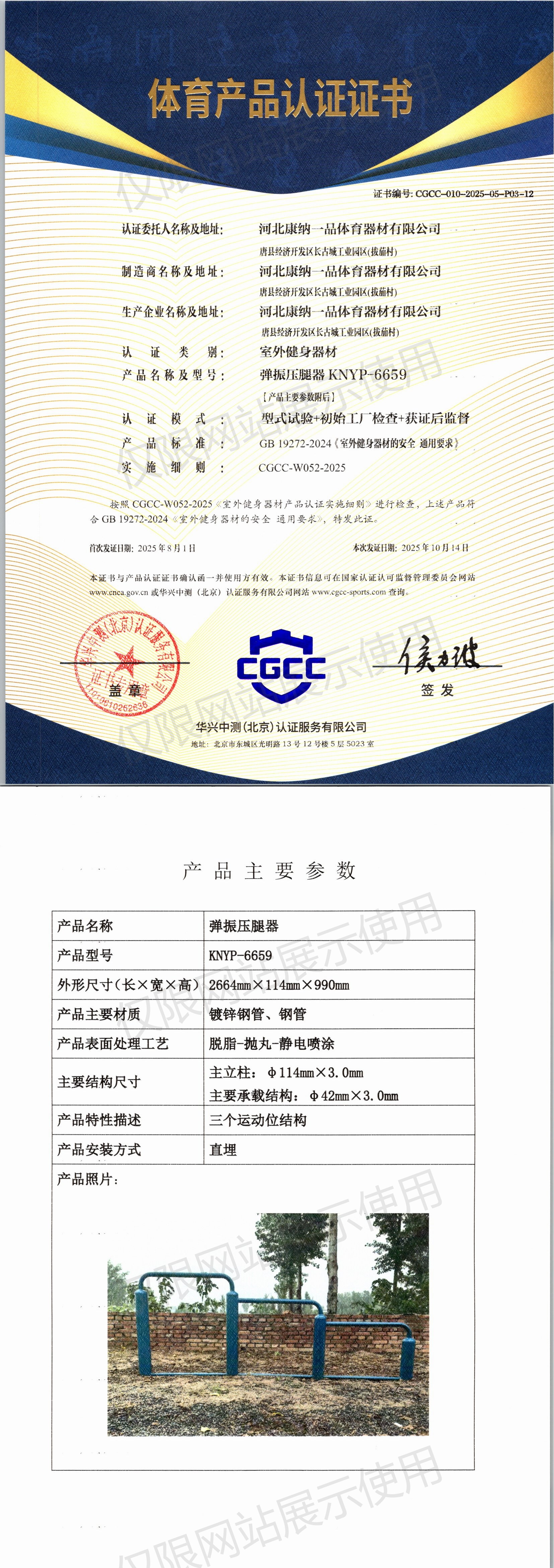 | 1 | 河北康纳一品体育器材有限公司 | CGCC-010-2025-05-P03-12 | 弹振压腿器 | KNYP-6659 | 唐县经济开发区长古城工业园区(拔茄村) | GB 19272-2024 | 2025-08-01 | 有效 | 查看 |
