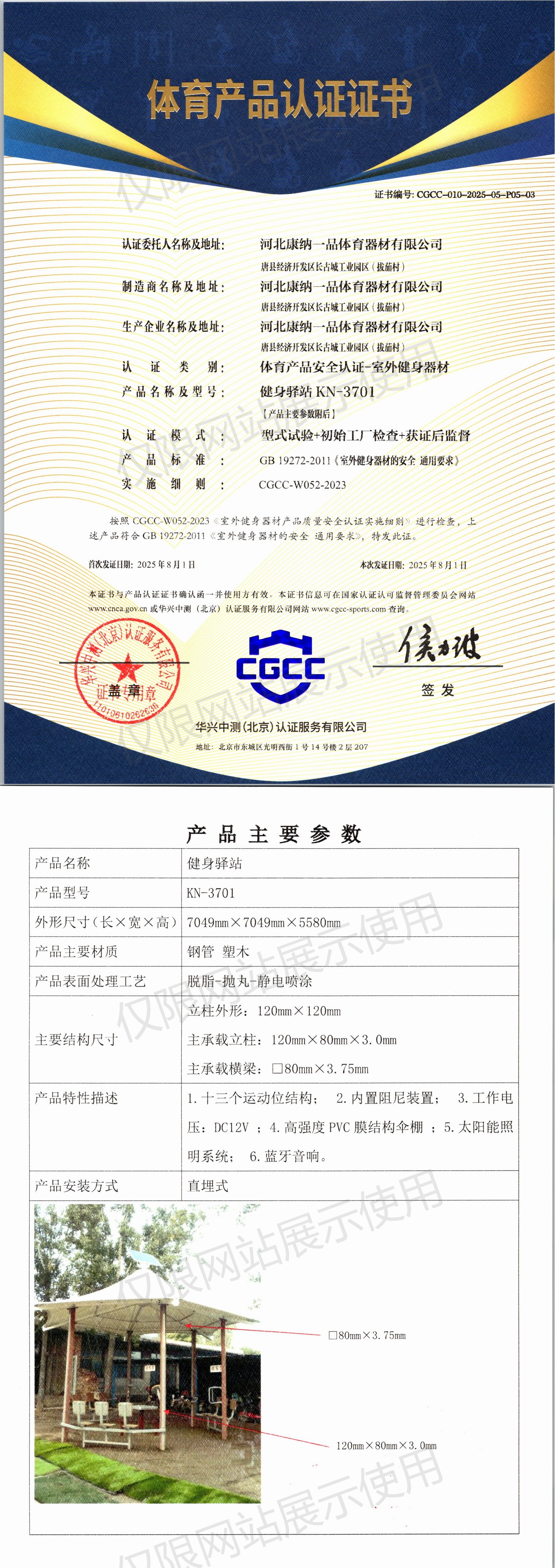 | 2 | 河北康纳一品体育器材有限公司 | CGCC-010-2025-05-P05-03 | 健身驿站 | KN-3701 | 唐县经济开发区长古城工业园区(拔茄村) | GB 19272-2011 | 2025-08-01 | 有效 | 查看 |