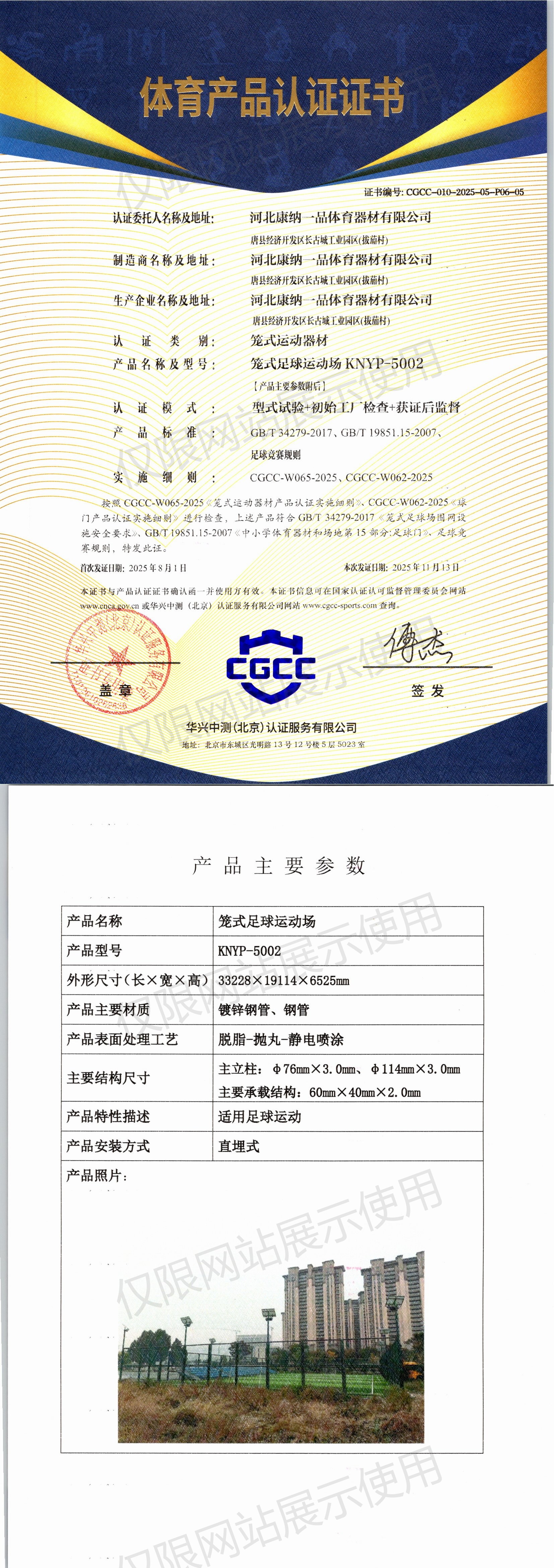 | 5 | 河北康纳一品体育器材有限公司 | CGCC-010-2025-05-P06-05 | 笼式足球运动场 | KNYP-5002 | 唐县经济开发区长古城工业园区(拔茄村) | GB/T 34279-2017GB/T 19851.15-2007足球竞赛规则 | 2025-08-01 | 有效 | 查看 |