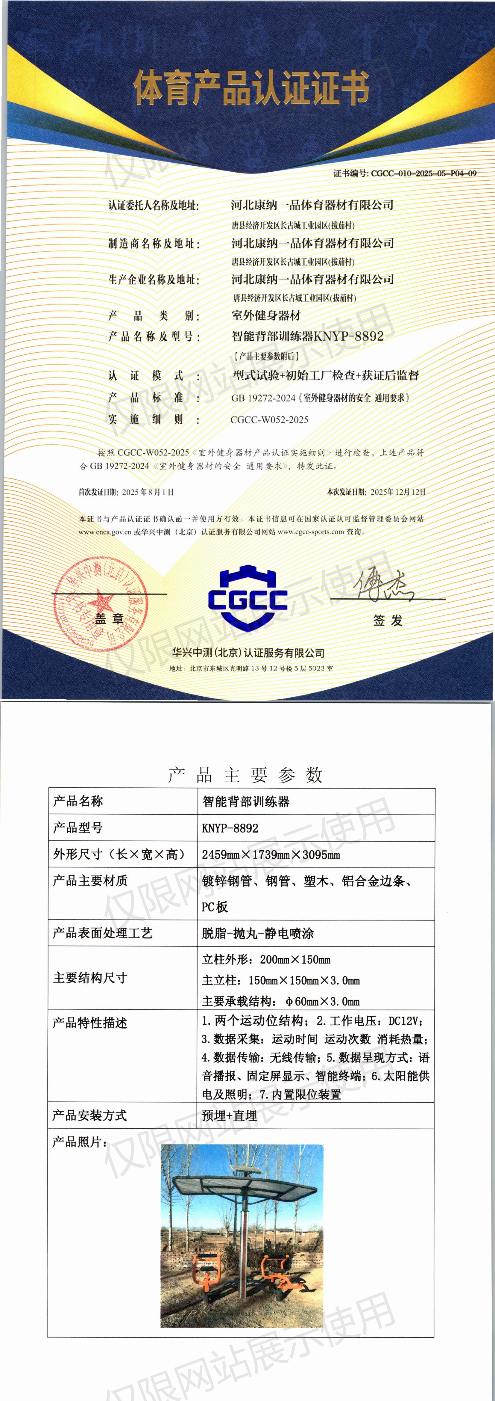 | 1 | 河北康纳一品体育器材有限公司 | CGCC-010-2025-05-P04-09 | 智能背部训练器 | KNYP-8892 | 唐县经济开发区长古城工业园区(拔茄村) | GB 19272-2024 | 2025-08-01 | 有效 | 查看 |