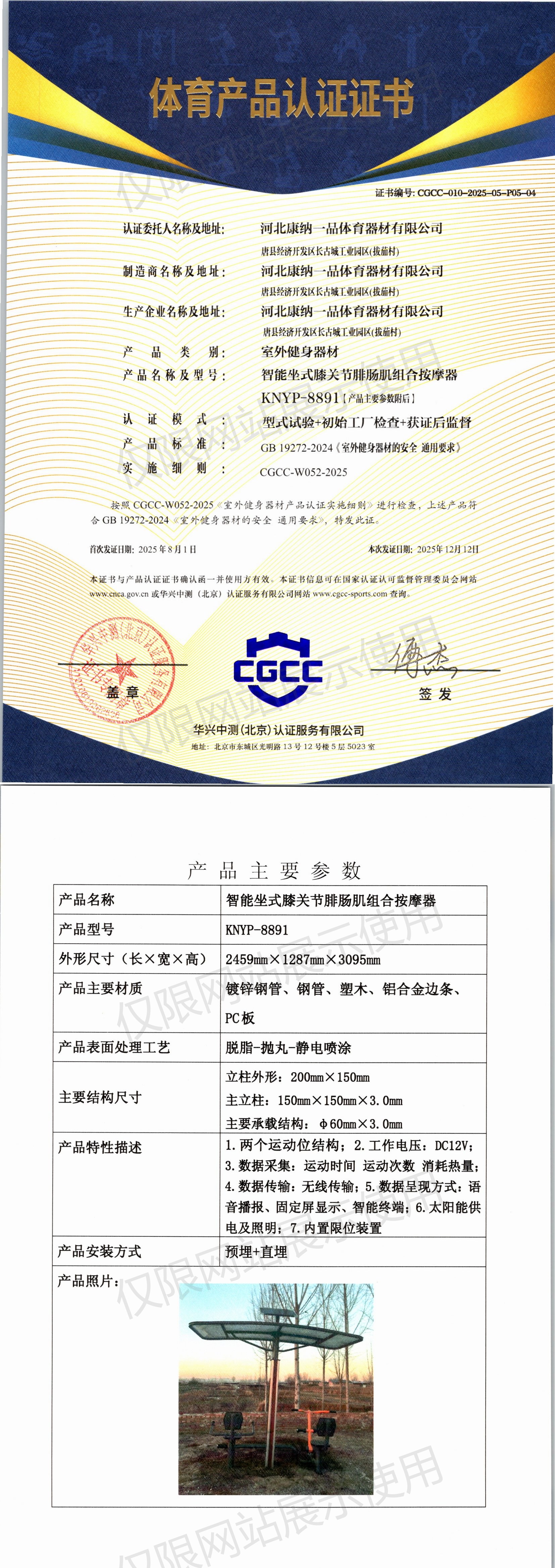 | 3 | 河北康纳一品体育器材有限公司 | CGCC-010-2025-05-P05-04 | 智能坐式膝关节腓肠肌组合按摩器 | KNYP-8891 | 唐县经济开发区长古城工业园区(拔茄村) | GB 19272-2024 | 2025-08-01 | 有效 | 查看 |