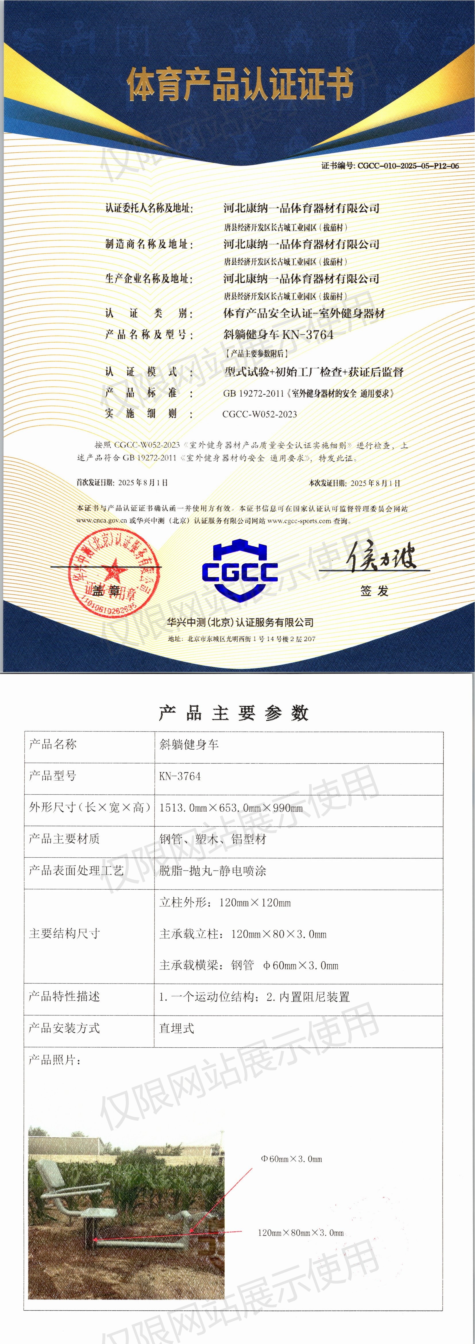 | 4 | 河北康纳一品体育器材有限公司 | CGCC-010-2025-05-P12-06 | 斜躺健身车 | KN-3764 | 唐县经济开发区长古城工业园区(拔茄村) | GB 19272-2011 | 2025-08-01 | 有效 | 查看 |