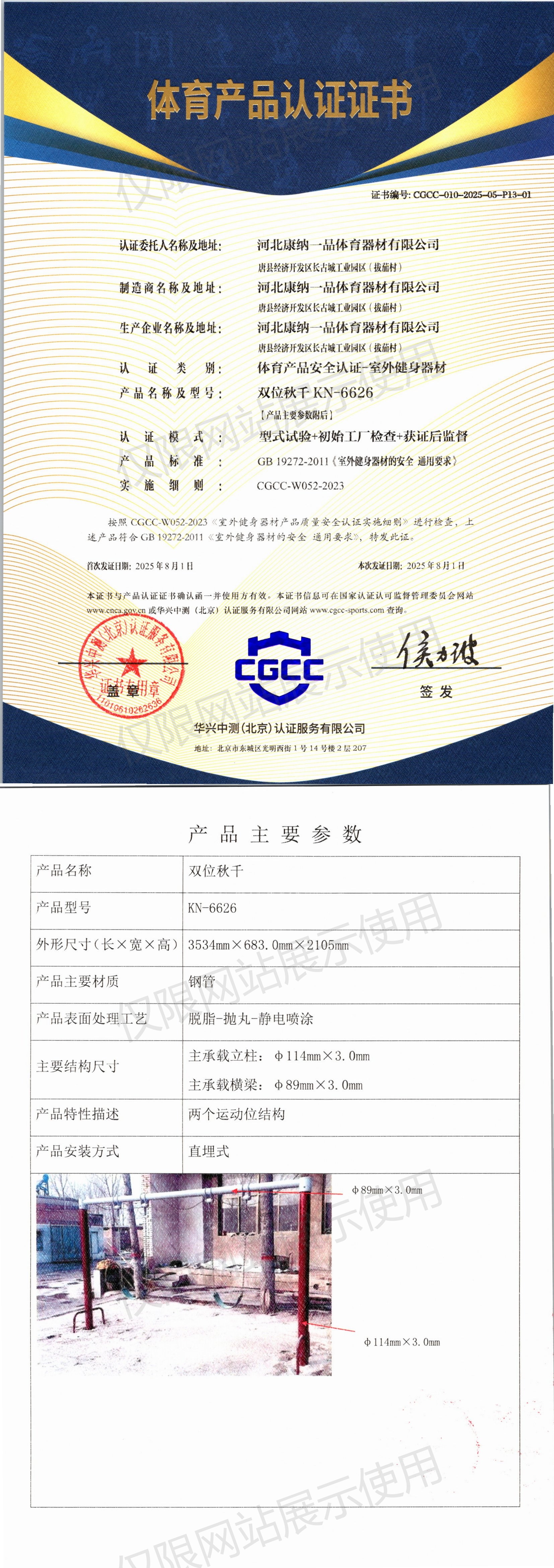 | 6 | 河北康纳一品体育器材有限公司 | CGCC-010-2025-05-P13-01 | 双位秋千 | KN-6626 | 唐县经济开发区长古城工业园区(拔茄村) | GB 19272-2011 | 2025-08-01 | 有效 | 查看 |
