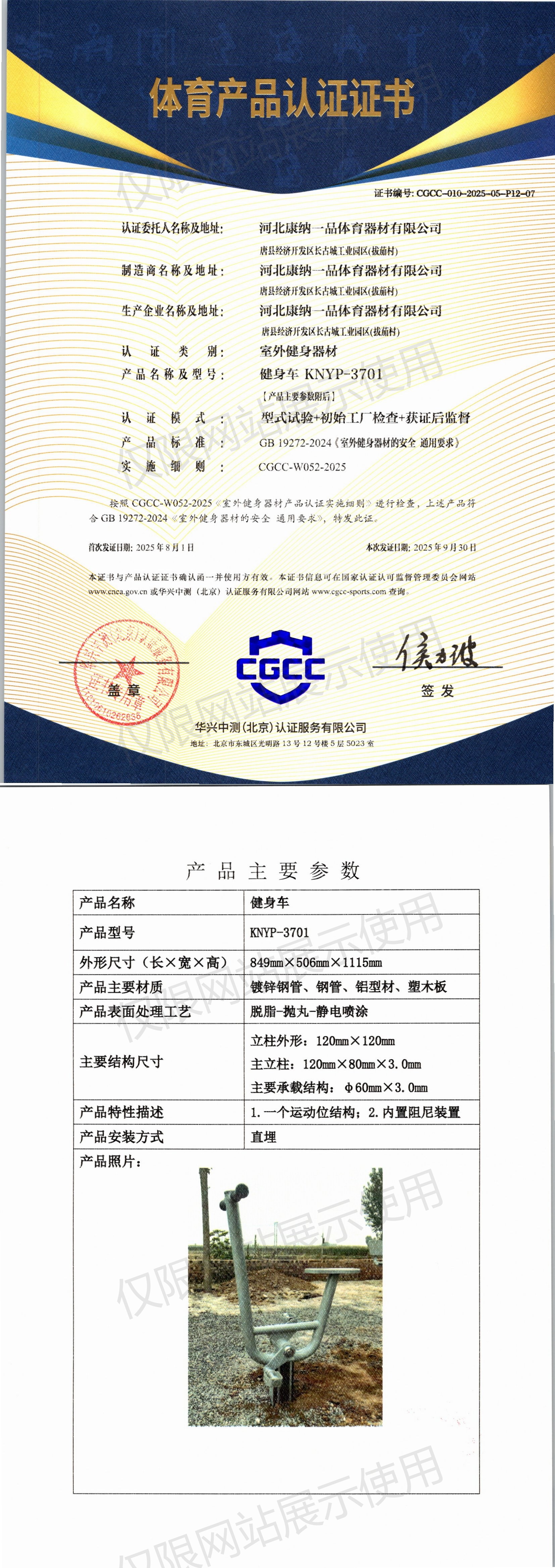 | 5 | 河北康纳一品体育器材有限公司 | CGCC-010-2025-05-P12-07 | 健身车 | KNYP-3701 | 唐县经济开发区长古城工业园区(拔茄村) | GB 19272-2024 | 2025-08-01 | 有效 | 查看 |