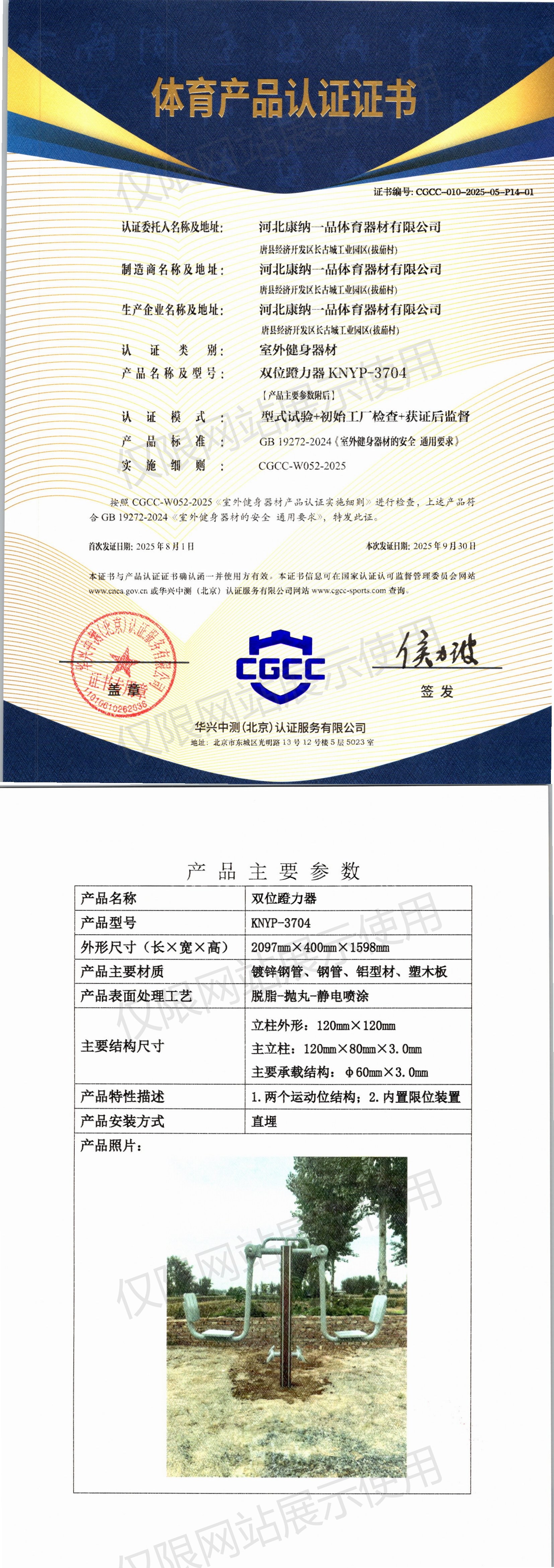 | 10 | 河北康纳一品体育器材有限公司 | CGCC-010-2025-05-P14-01 | 双位蹬力器 | KNYP-3704 | 唐县经济开发区长古城工业园区(拔茄村) | GB 19272-2024 | 2025-08-01 | 有效 | 查看 |