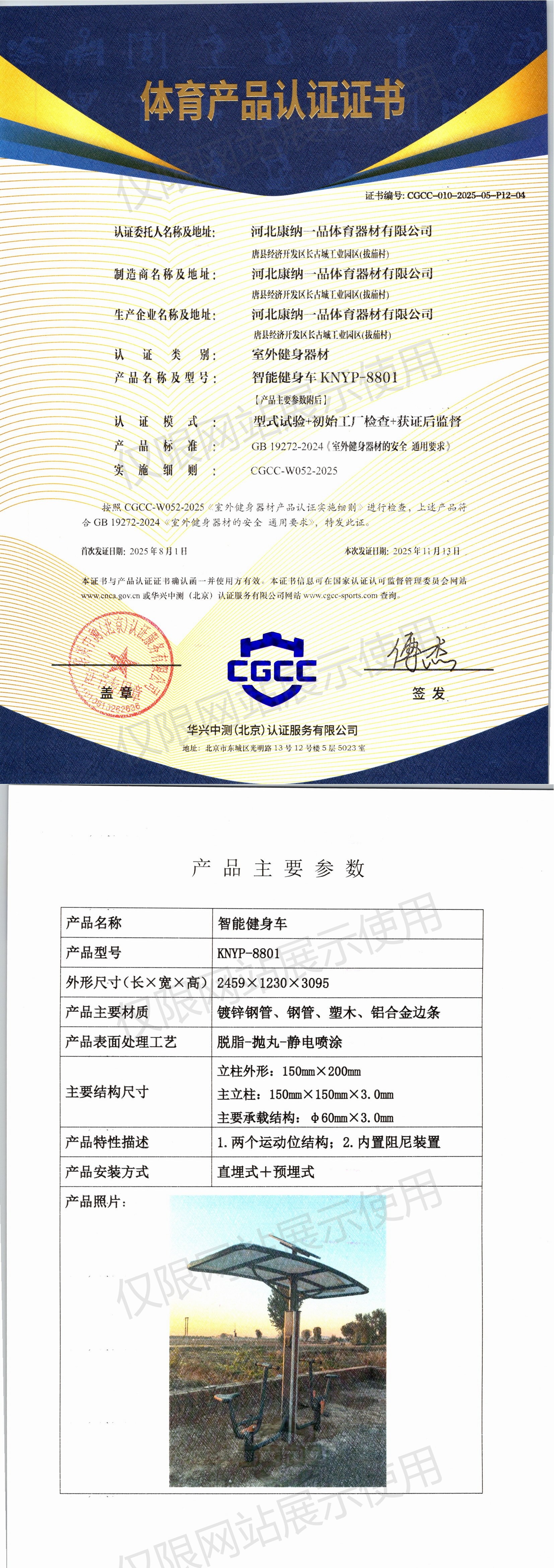 | 2 | 河北康纳一品体育器材有限公司 | CGCC-010-2025-05-P12-04 | 智能健身车 | KNYP-8801 | 唐县经济开发区长古城工业园区(拔茄村) | GB 19272-2024 | 2025-08-01 | 有效 | 查看 |