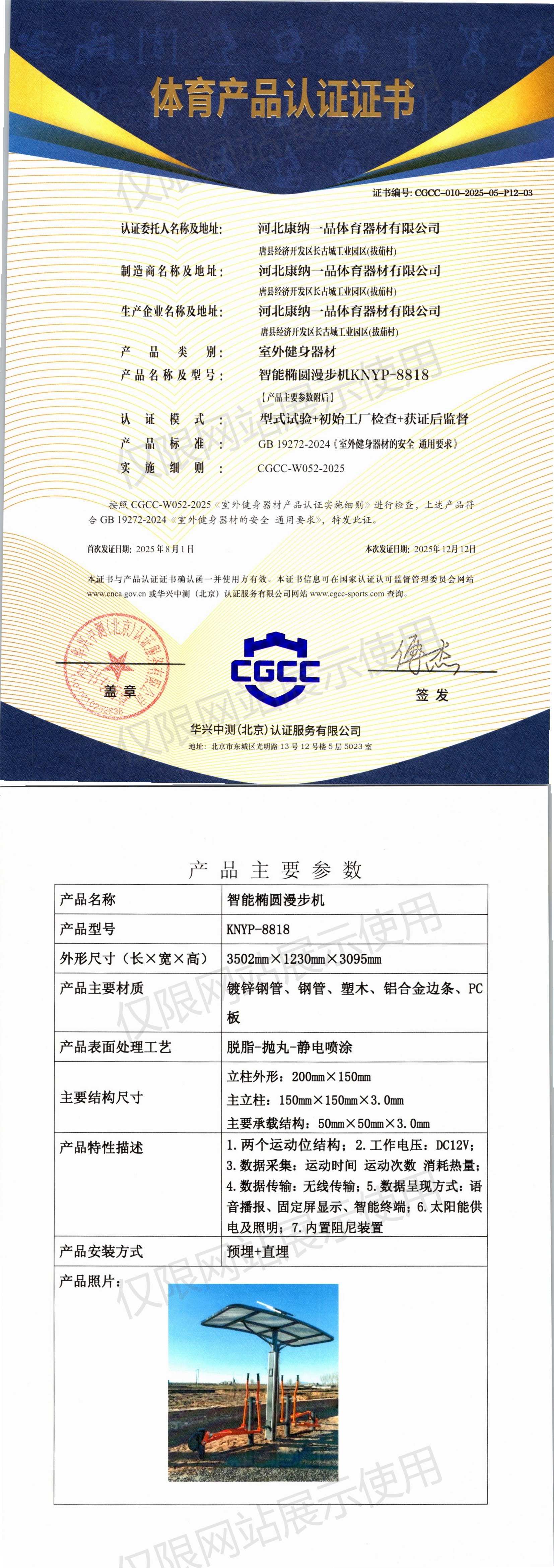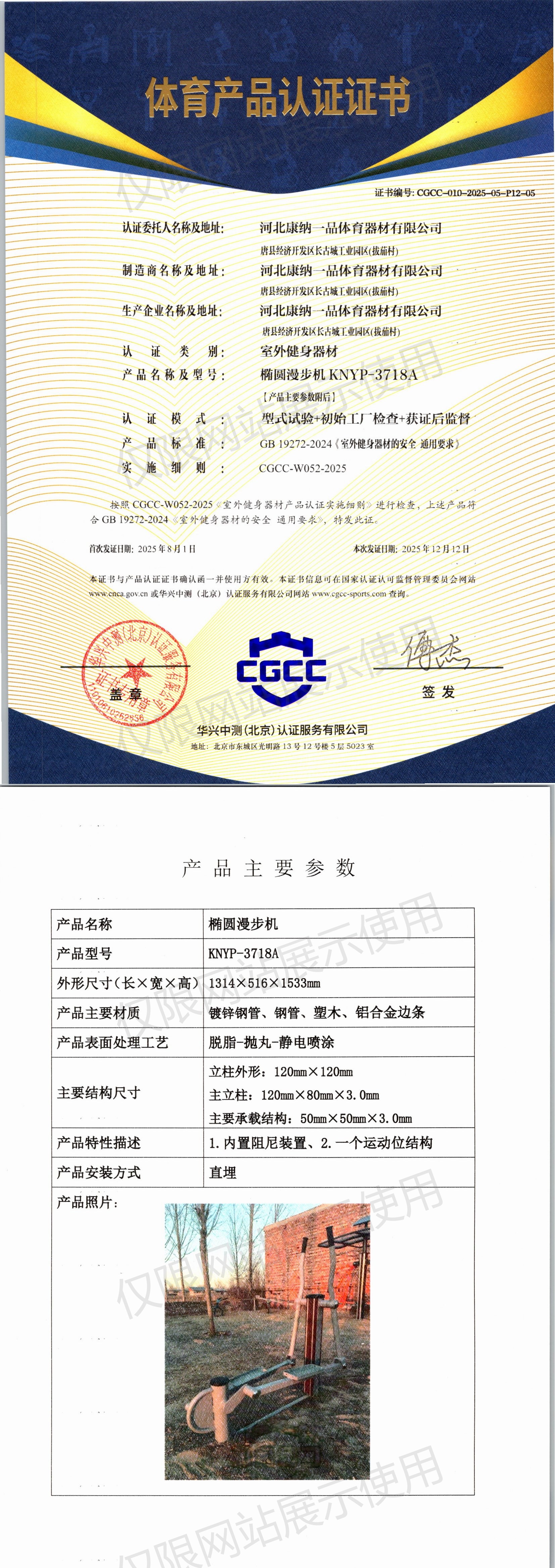 | 3 | 河北康纳一品体育器材有限公司 | CGCC-010-2025-05-P12-05 | 椭圆漫步机 | KNYP-3718A | 唐县经济开发区长古城工业园区(拔茄村) | GB 19272-2024 | 2025-08-01 | 有效 | 查看 |