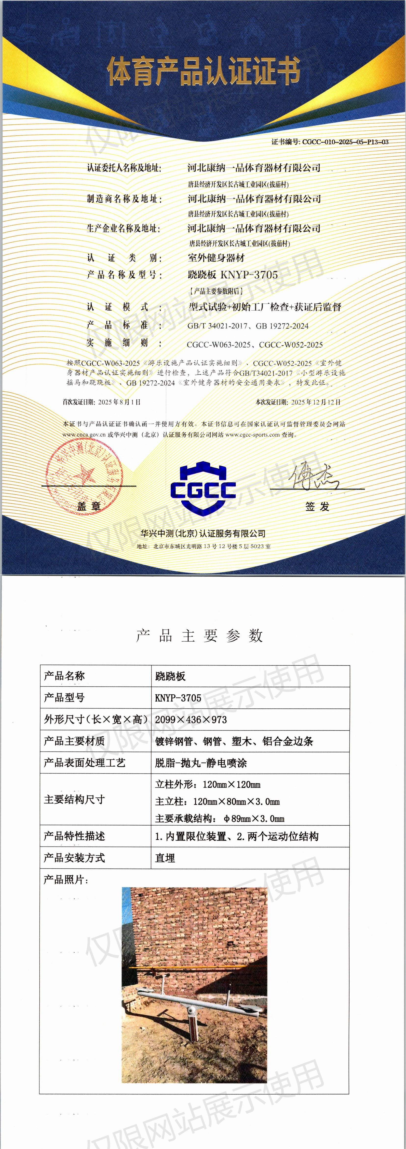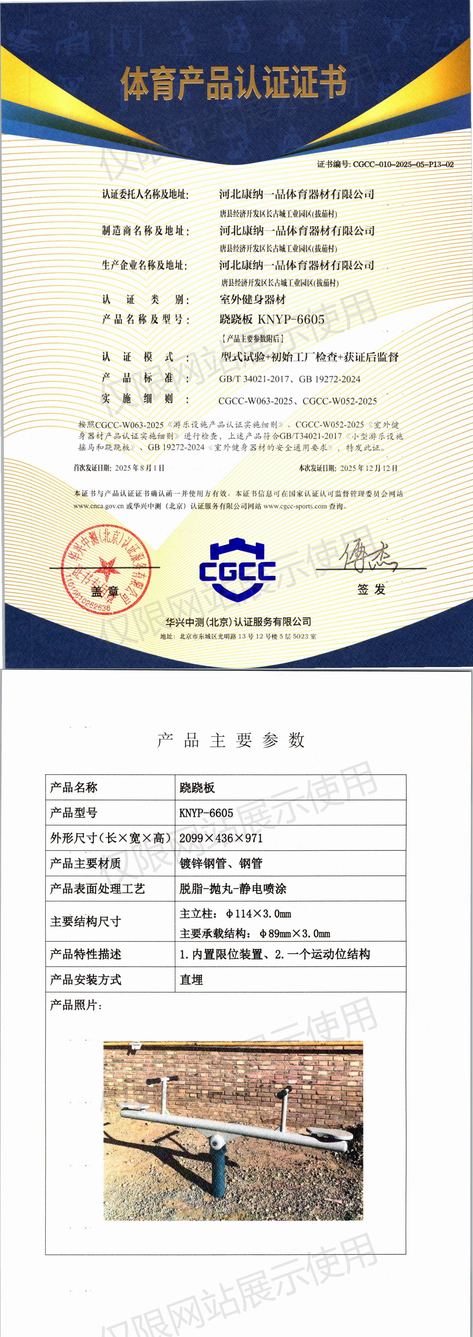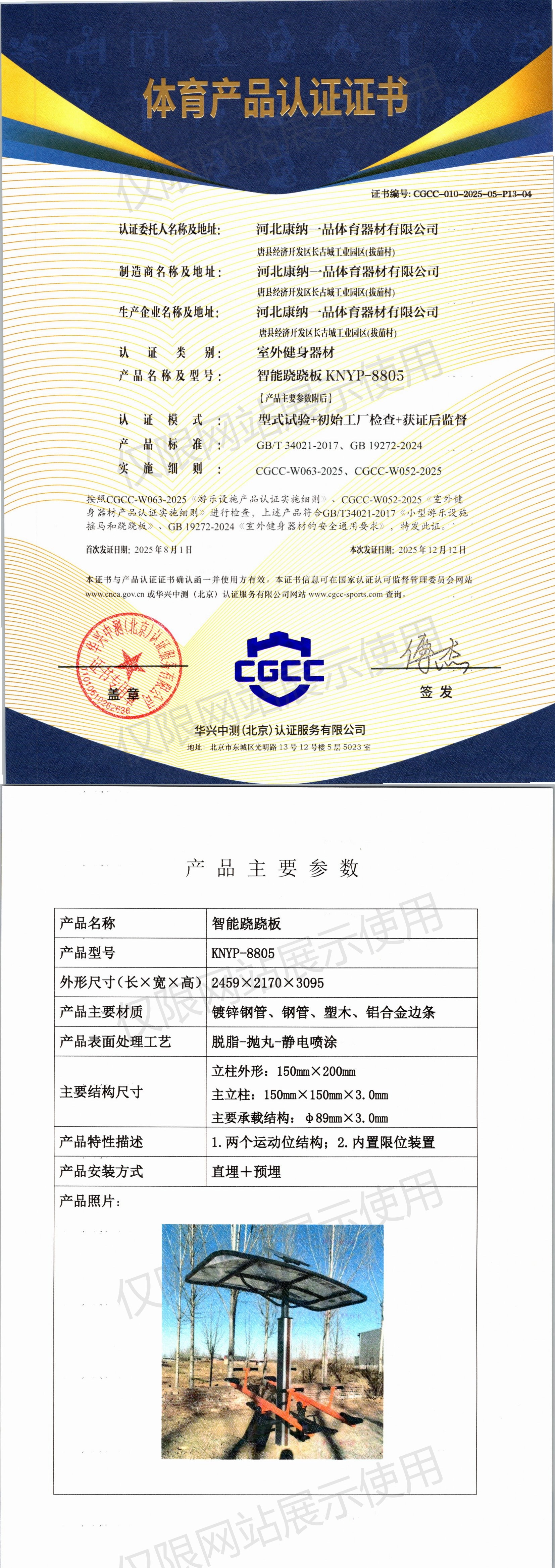 | 9 | 河北康纳一品体育器材有限公司 | CGCC-010-2025-05-P13-04 | 智能跷跷板 | KNYP-8805 | 唐县经济开发区长古城工业园区(拔茄村) | GB/T 34021-2017、GB 19272-2024 | 2025-08-01 | 有效 | 查看 |