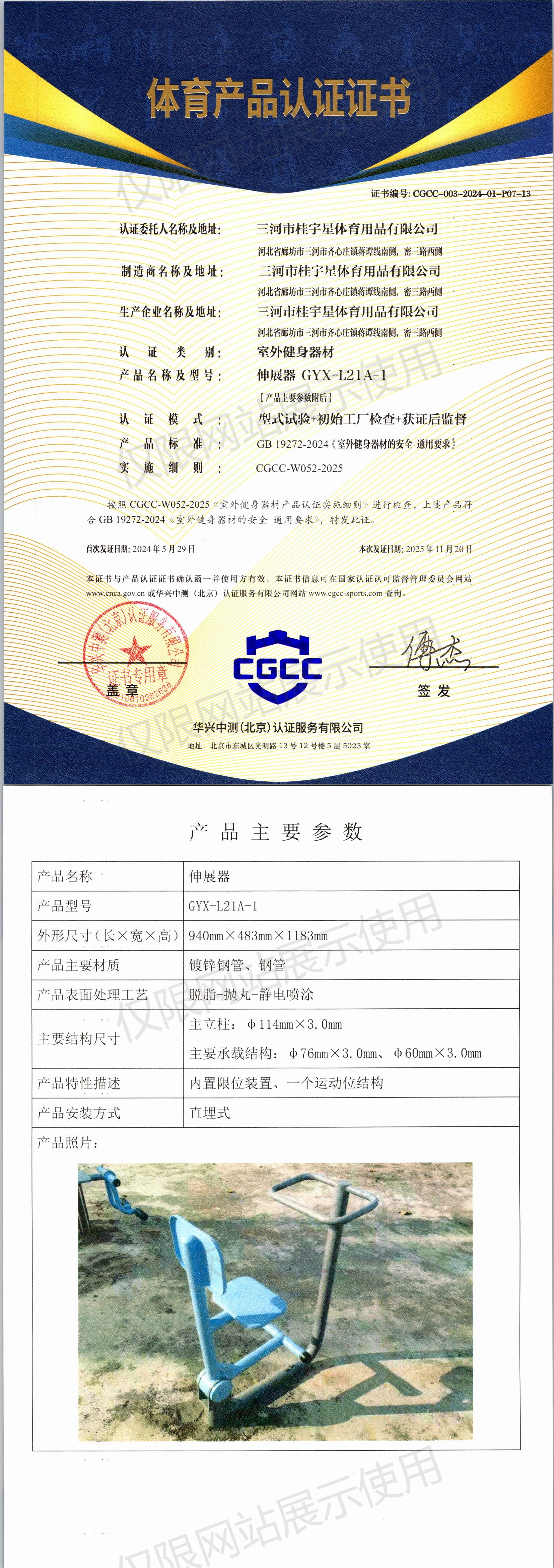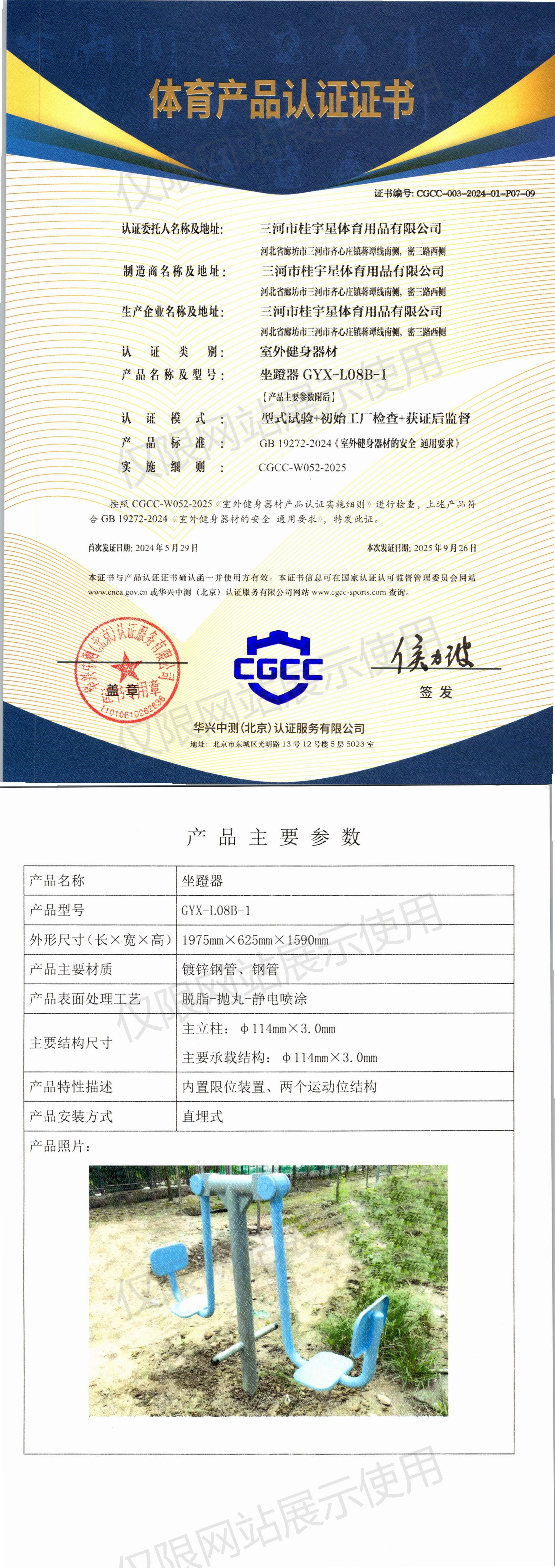 | 4 | 三河市桂宇星体育用品有限公司 | CGCC-003-2024-01-P07-09 | 坐蹬器 | GYX-L08B-1 | 河北省廊坊市三河市齐心庄镇蒋谭线南侧,密三路西侧 | GB 19272-2024 | 2024-05-29 | 有效 | 查看 |