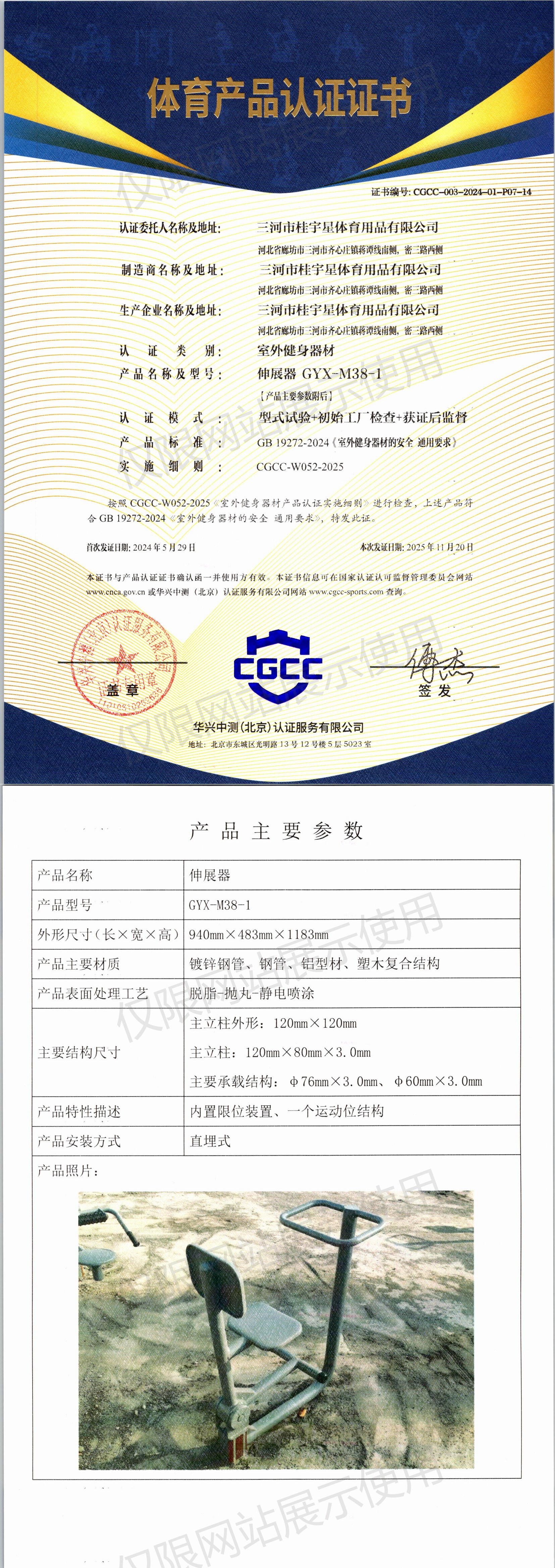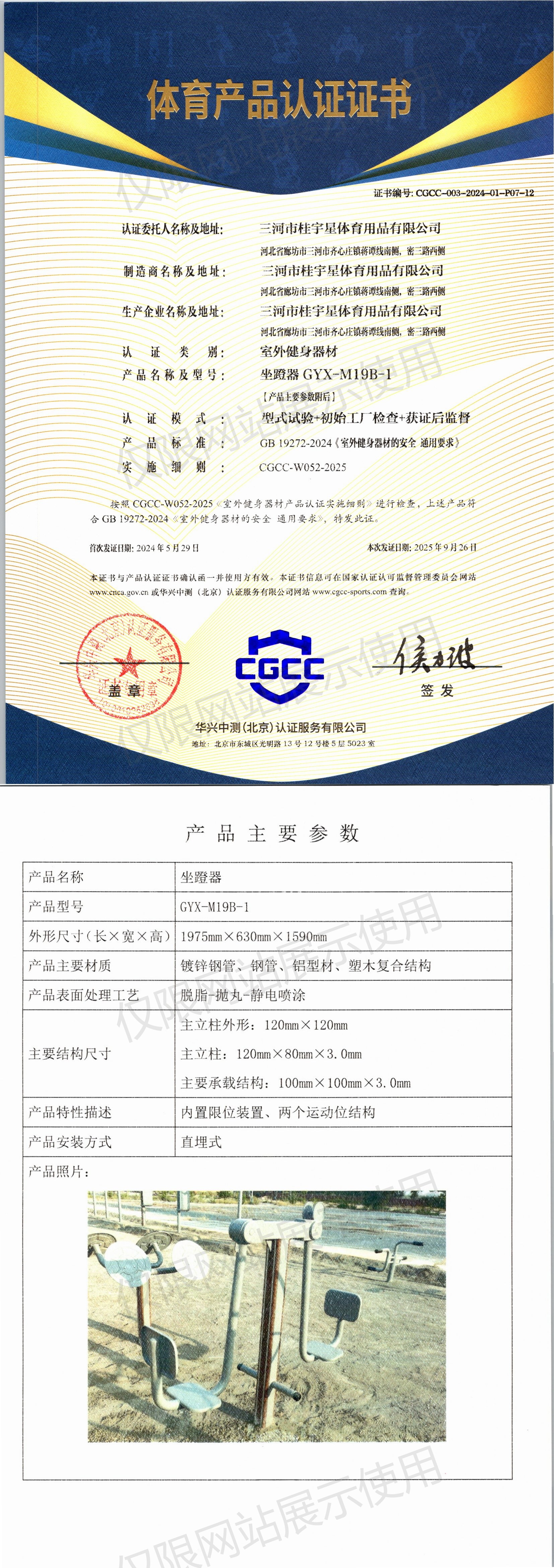 | 7 | 三河市桂宇星体育用品有限公司 | CGCC-003-2024-01-P07-12 | 坐蹬器 | GYX-M19B-1 | 河北省廊坊市三河市齐心庄镇蒋谭线南侧,密三路西侧 | GB 19272-2024 | 2024-05-29 | 有效 | 查看 |