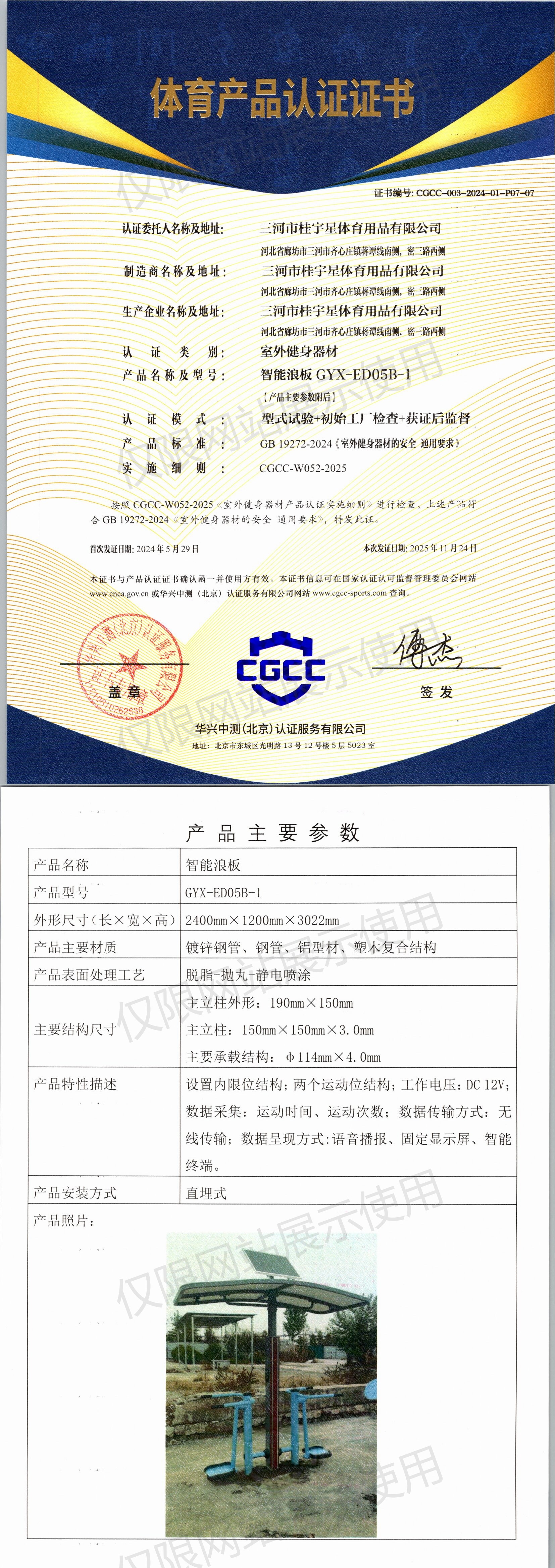 | 2 | 三河市桂宇星体育用品有限公司 | CGCC-003-2024-01-P07-07 | 智能浪板 | GYX-ED05B-1 | 河北省廊坊市三河市齐心庄镇蒋谭线南侧,密三路西侧 | GB 19272-2024 | 2024-05-29 | 有效 | 查看 |