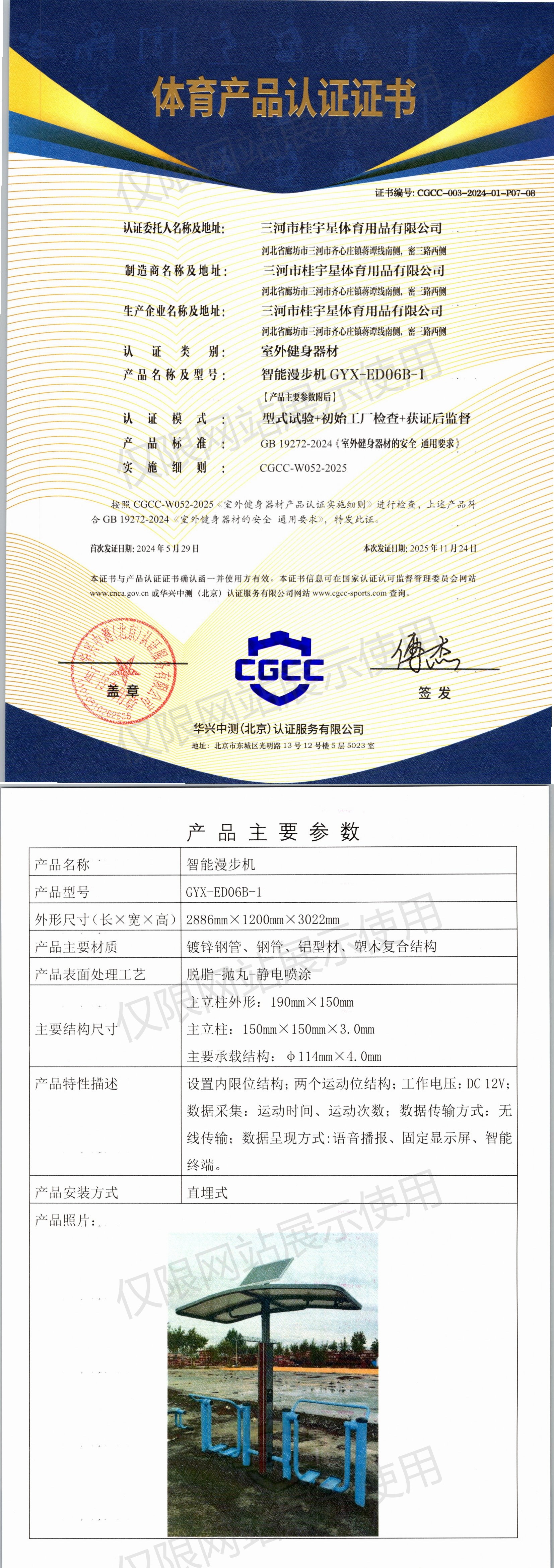 | 3 | 三河市桂宇星体育用品有限公司 | CGCC-003-2024-01-P07-08 | 智能漫步机 | GYX-ED06B-1 | 河北省廊坊市三河市齐心庄镇蒋谭线南侧,密三路西侧 | GB 19272-2024 | 2024-05-29 | 有效 | 查看 |