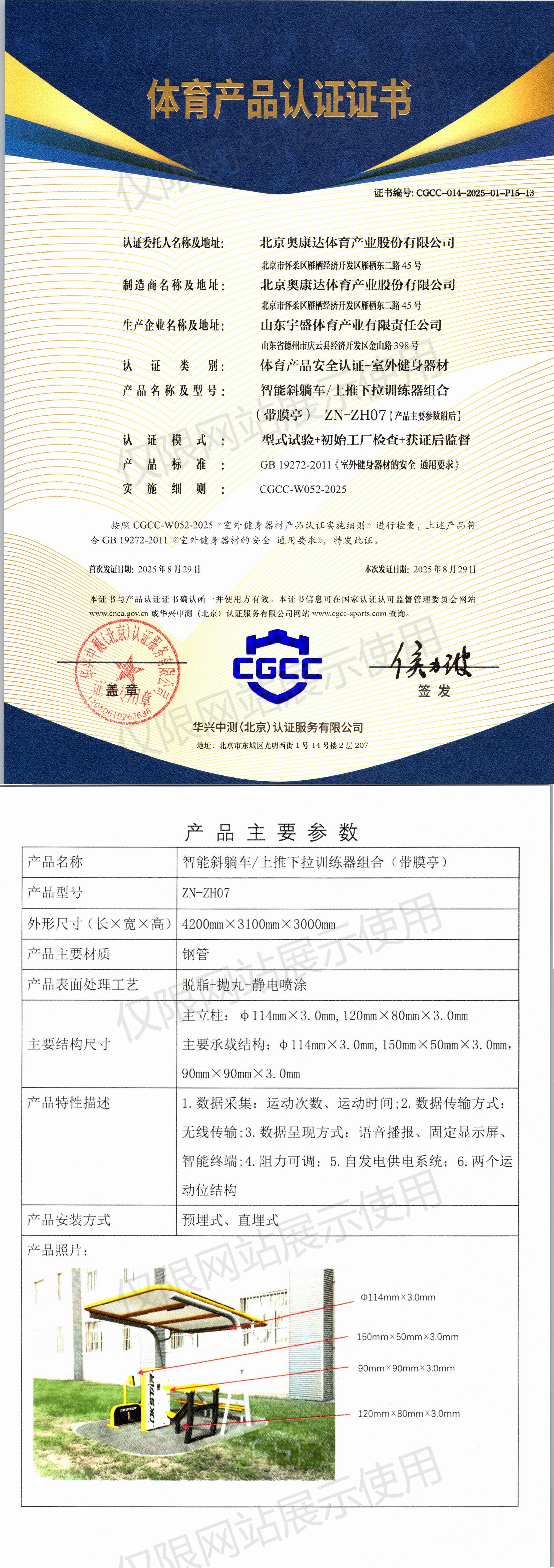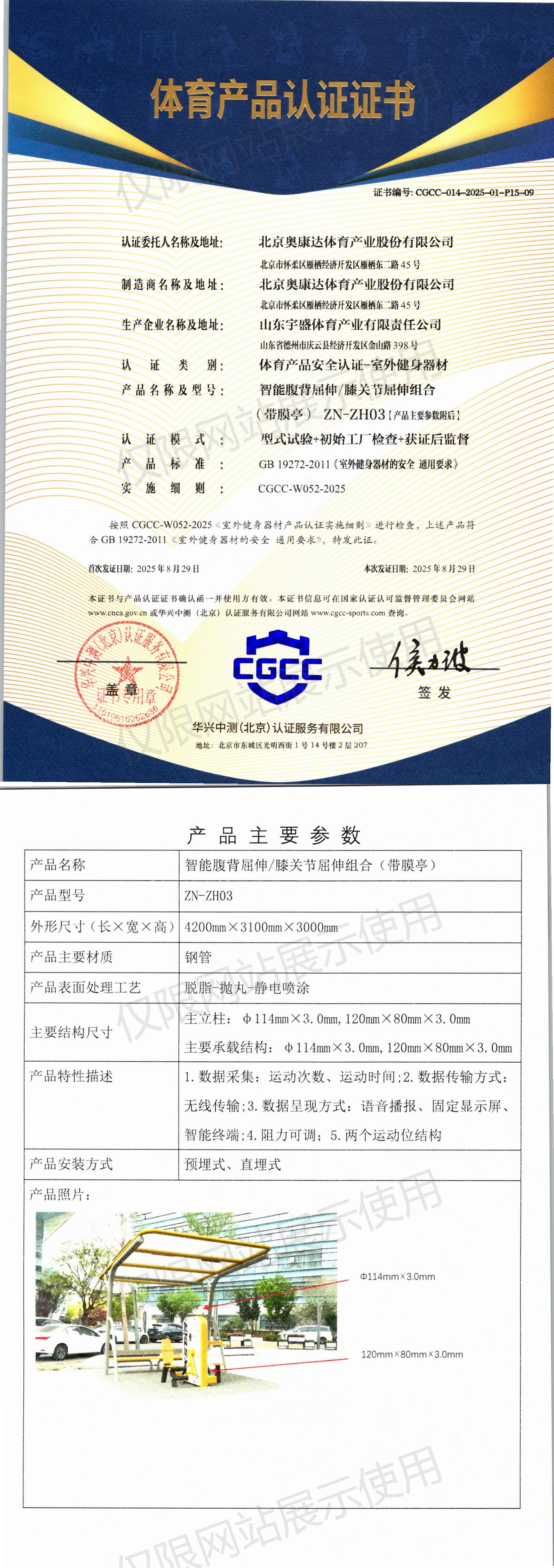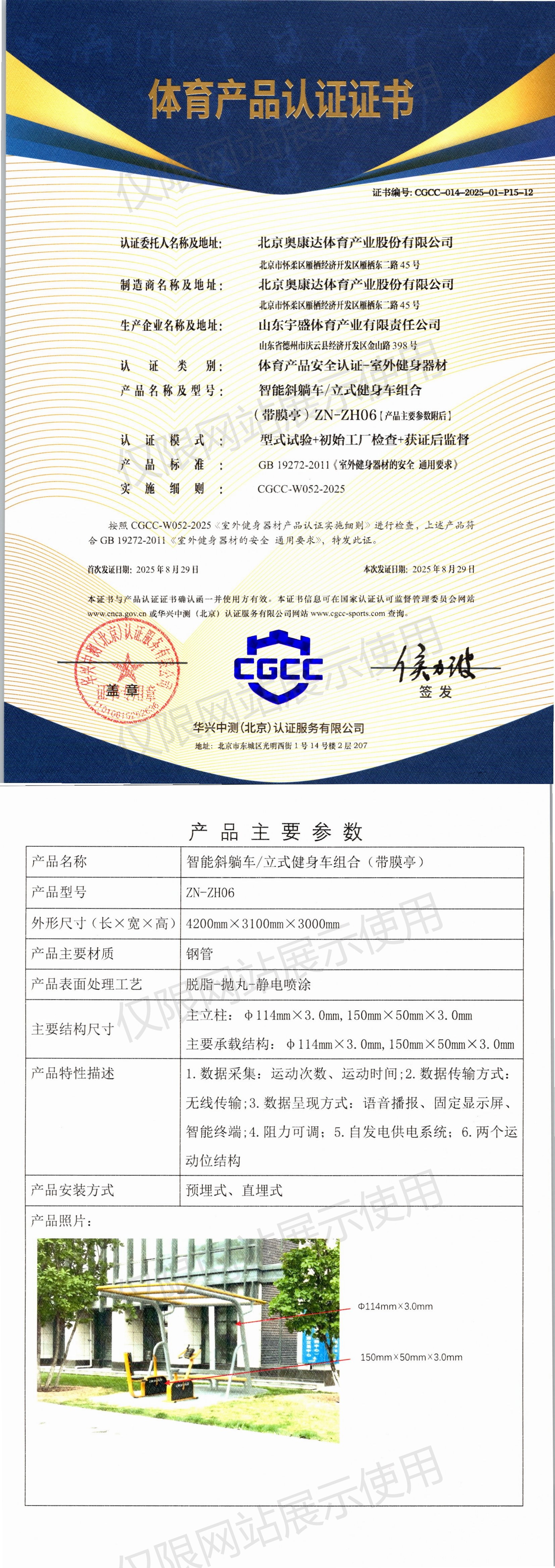 | 9 | 北京奥康达体育产业股份有限公司 | CGCC-014-2025-01-P15-12 | ZN-ZH06 | 智能斜躺车/立式健身车组合(带膜亭) | 山东宇盛体育产业有限责任公司 | GB 19272-2011 | 2025-08-29 | 有效 | 查看 |
