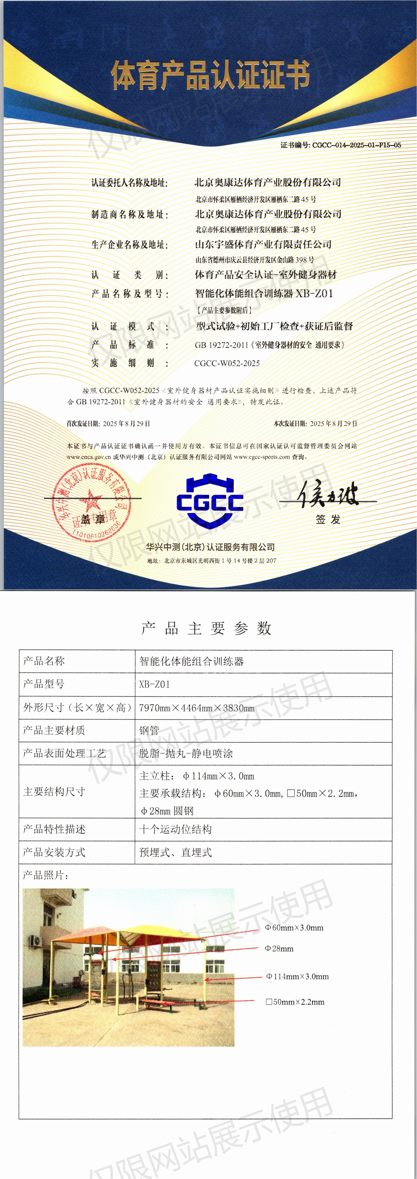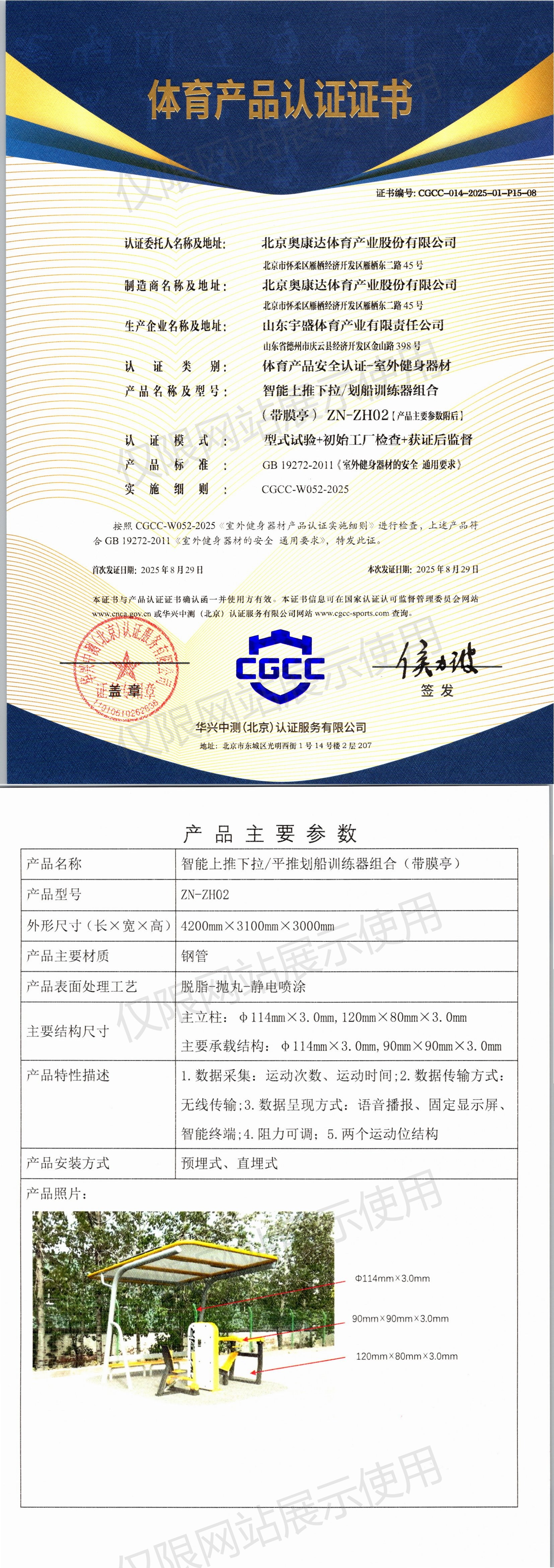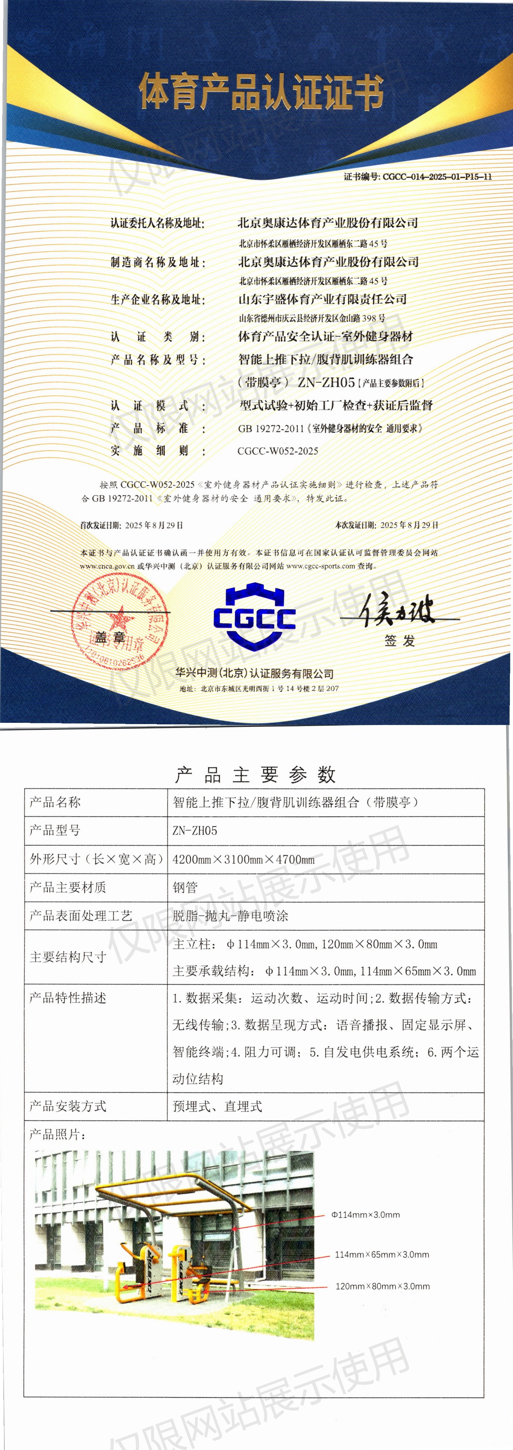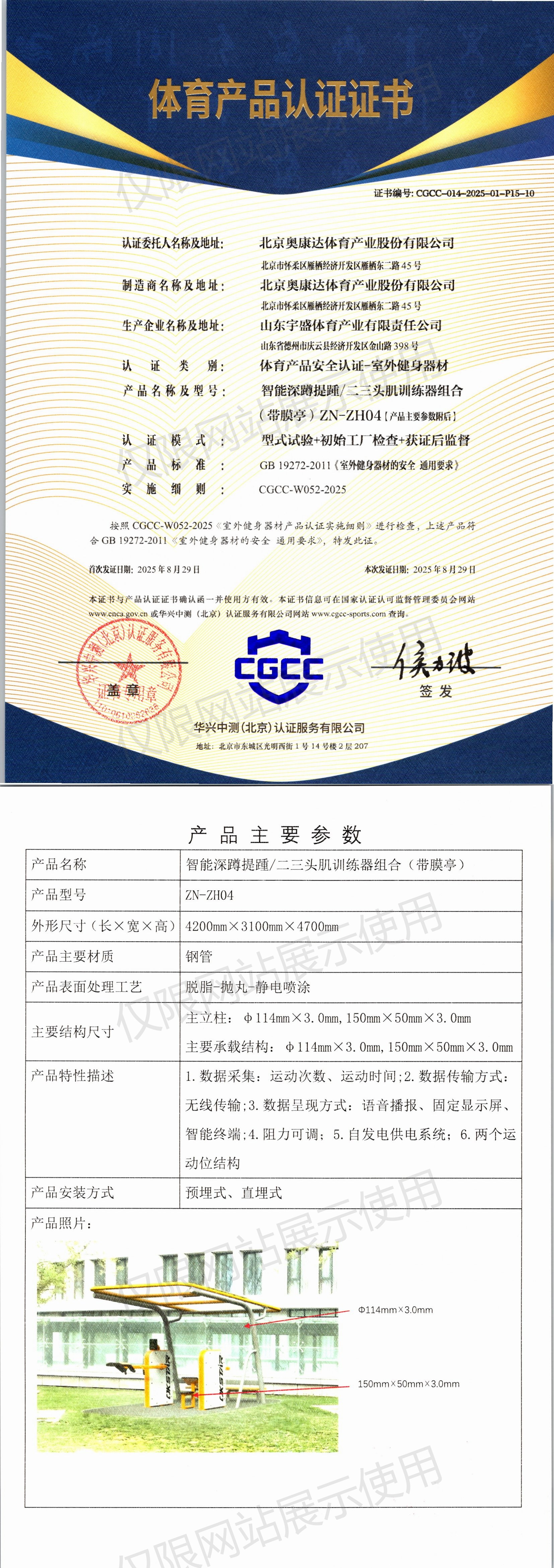 | 9 | 北京奥康达体育产业股份有限公司 | CGCC-014-2025-01-P15-12 | ZN-ZH06 | 智能斜躺车/立式健身车组合(带膜亭) | 山东宇盛体育产业有限责任公司 | GB 19272-2011 | 2025-08-29 | 有效 | 查看 |