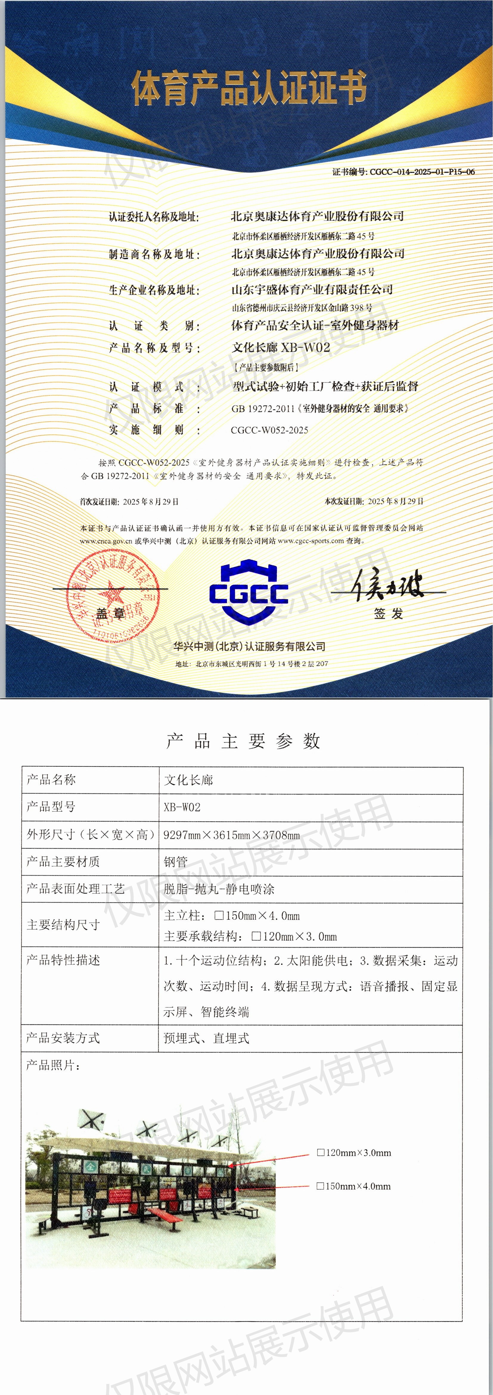 | 3 | 北京奥康达体育产业股份有限公司 | CGCC-014-2025-01-P15-06 | XB-W02 | 文化长廊 | 山东宇盛体育产业有限责任公司 | GB 19272-2011 | 2025-08-29 | 有效 | 查看 |