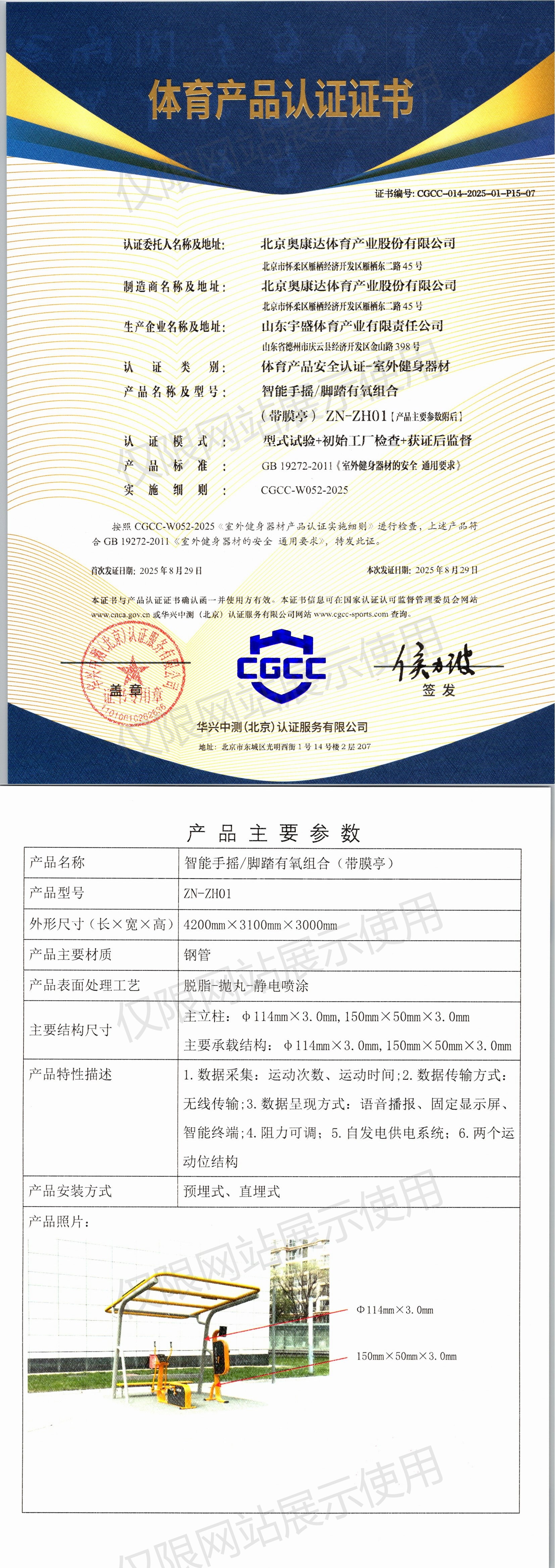 | 4 | 北京奥康达体育产业股份有限公司 | CGCC-014-2025-01-P15-07 | ZN-ZH01 | 智能手摇/脚踏有氧组合(带膜亭) | 山东宇盛体育产业有限责任公司 | GB 19272-2011 | 2025-08-29 | 有效 | 查看 |