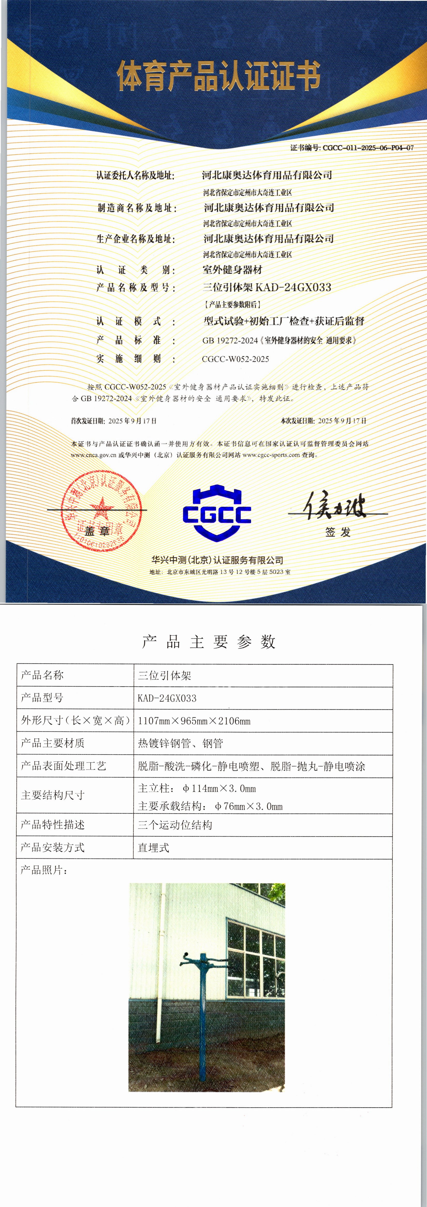 | 2 | 河北康奥达体育用品有限公司 | CGCC-011-2025-06-P04-07 | 三位引体架 | KAD-24GX033 | 河北省保定市定州市大奇连工业区 | GB 19272-2024 | 2025-09-17 | 有效 | 查看 |