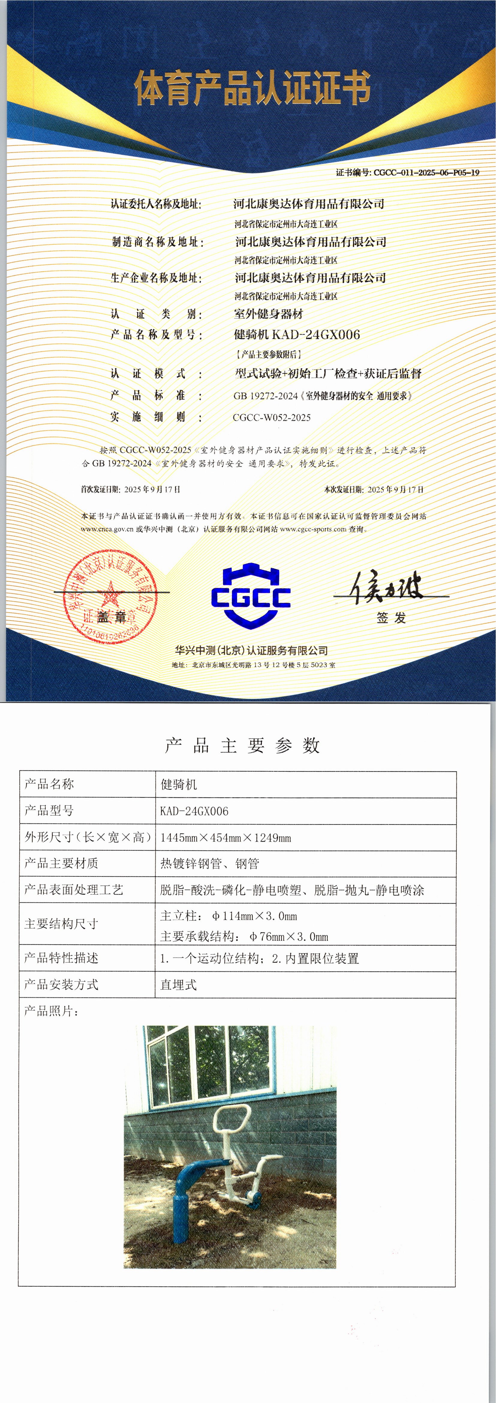 | 5 | 河北康奥达体育用品有限公司 | CGCC-011-2025-06-P05-19 | 健骑机 | KAD-24GX006 | 河北省保定市定州市大奇连工业区 | GB 19272-2024 | 2025-09-17 | 有效 | 查看 |