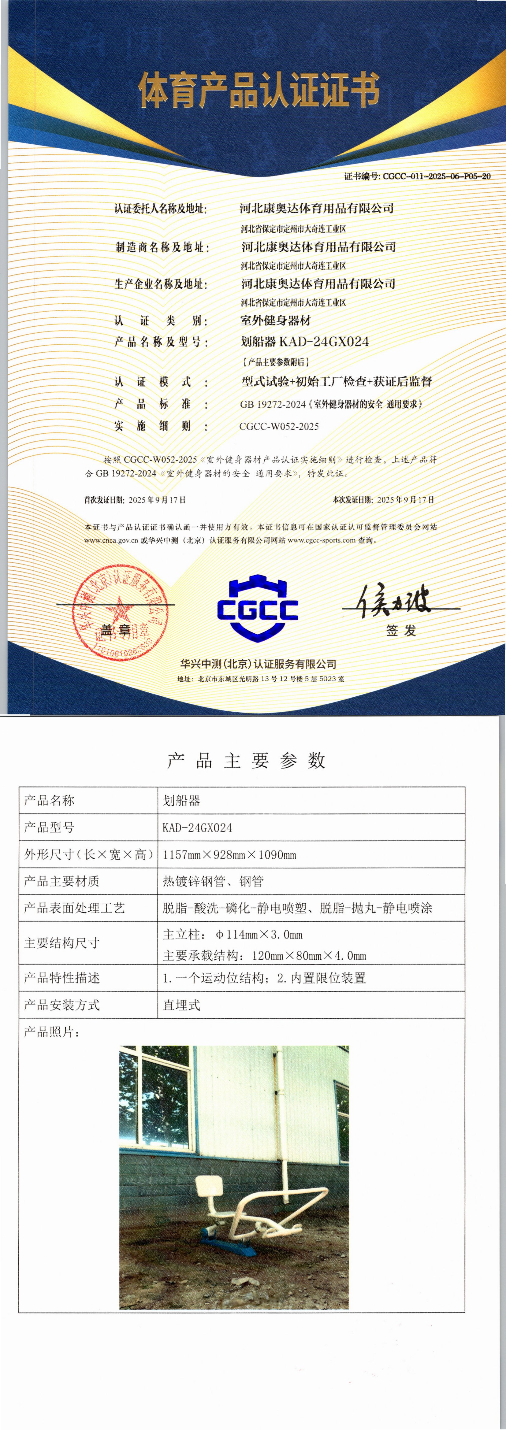 | 6 | 河北康奥达体育用品有限公司 | CGCC-011-2025-06-P05-20 | 划船器 | KAD-24GX024 | 河北省保定市定州市大奇连工业区 | GB 19272-2024 | 2025-09-17 | 有效 | 查看 |