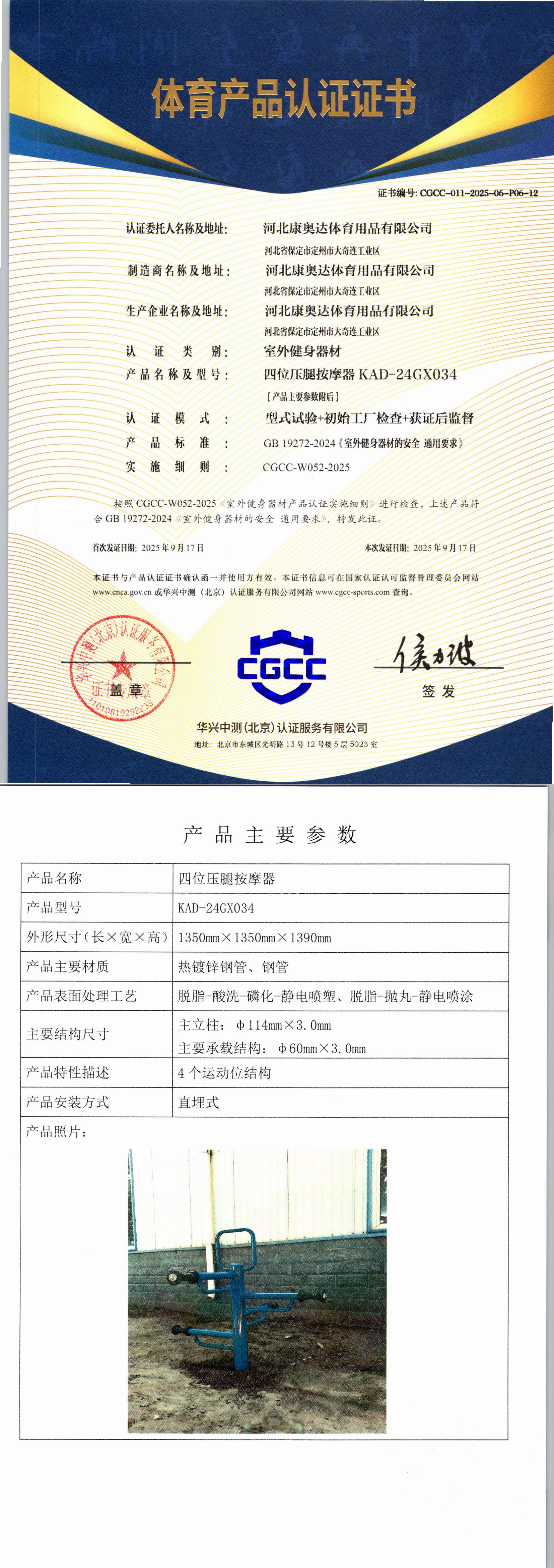 | 7 | 河北康奥达体育用品有限公司 | CGCC-011-2025-06-P06-12 | 四位压腿按摩器 | KAD-24GX034 | 河北省保定市定州市大奇连工业区 | GB 19272-2024 | 2025-09-17 | 有效 | 查看 |