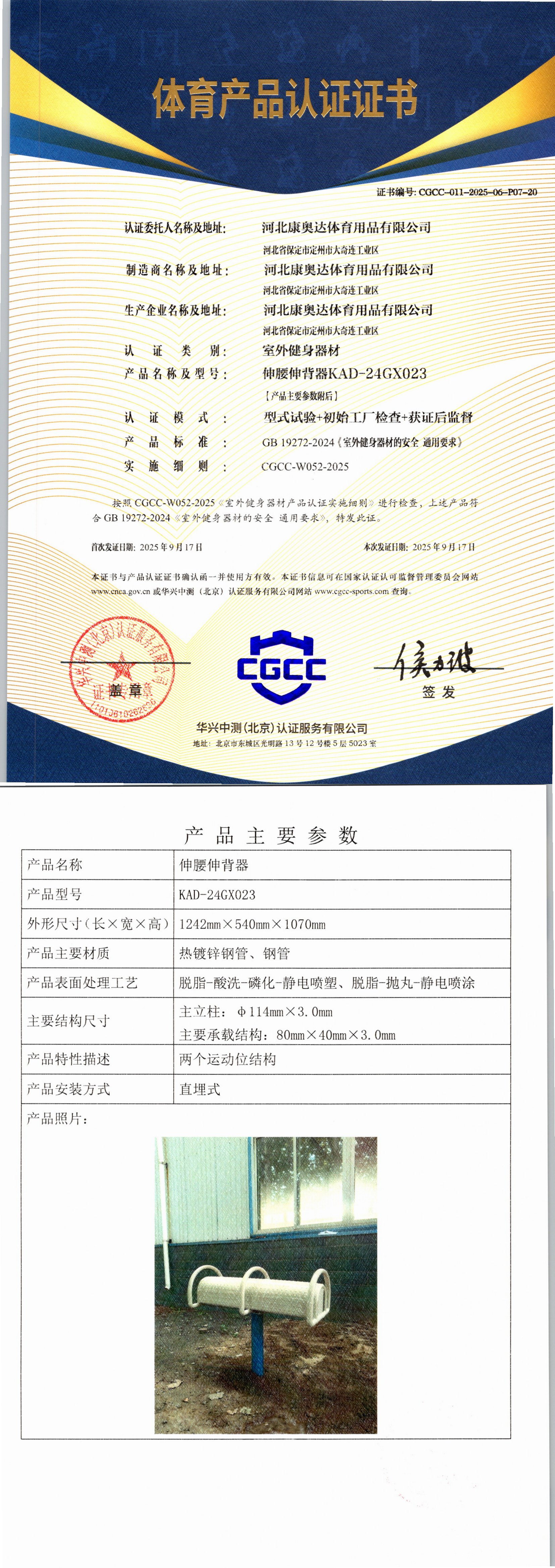 | 8 | 河北康奥达体育用品有限公司 | CGCC-011-2025-06-P07-20 | 伸腰伸背器 | KAD-24GX023 | 河北省保定市定州市大奇连工业区 | GB 19272-2024 | 2025-09-17 | 有效 | 查看 |