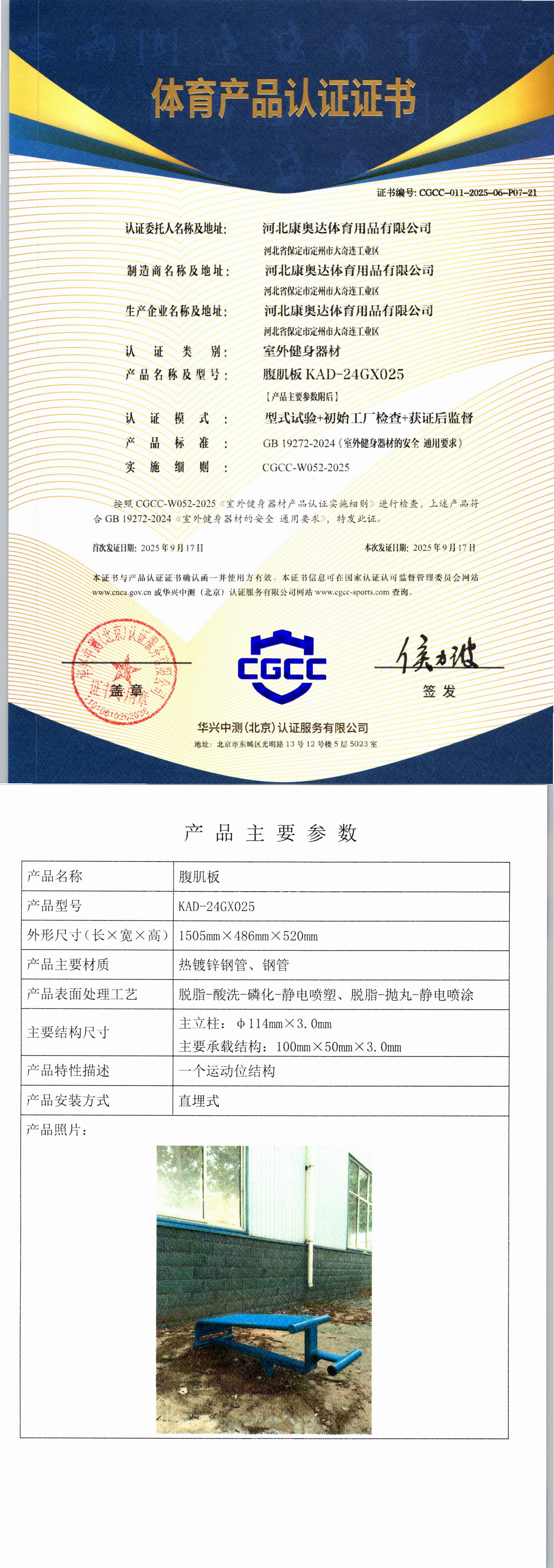 | 9 | 河北康奥达体育用品有限公司 | CGCC-011-2025-06-P07-21 | 腹肌板 | KAD-24GX025 | 河北省保定市定州市大奇连工业区 | GB 19272-2024 | 2025-09-17 | 有效 | 查看 |