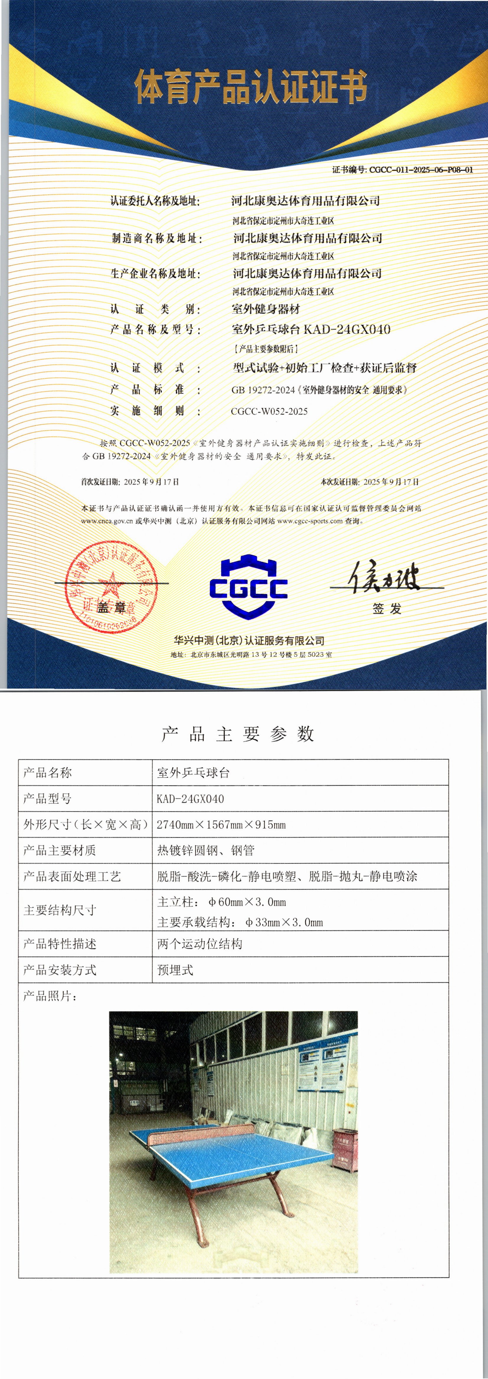 | 10 | 河北康奥达体育用品有限公司 | CGCC-011-2025-06-P08-01 | 室外乒乓球台 | KAD-24GX040 | 河北省保定市定州市大奇连工业区 | GB 19272-2024 | 2025-09-17 | 有效 | 查看 |