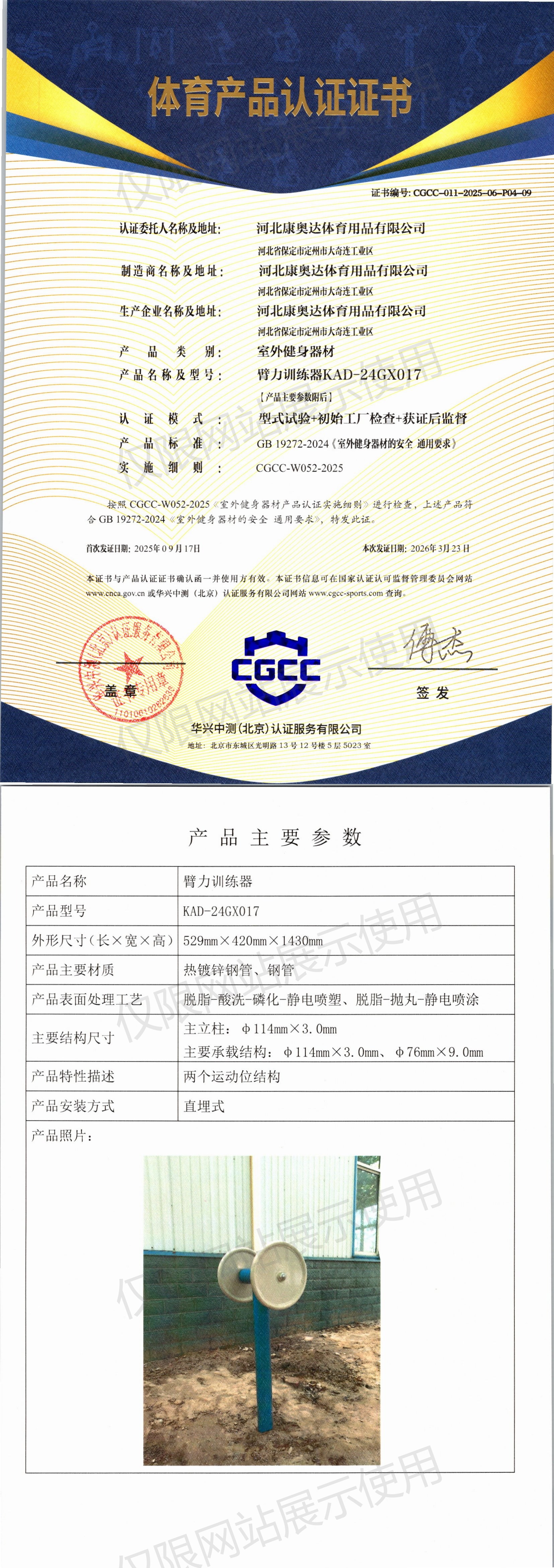 | 4 | 河北康奥达体育用品有限公司 | CGCC-011-2025-06-P04-09 | 臂力训练器 | KAD-24GX017 | 河北省保定市定州市大奇连工业区 | GB 19272-2024 | 2025-09-17 | 有效 | 查看 |
