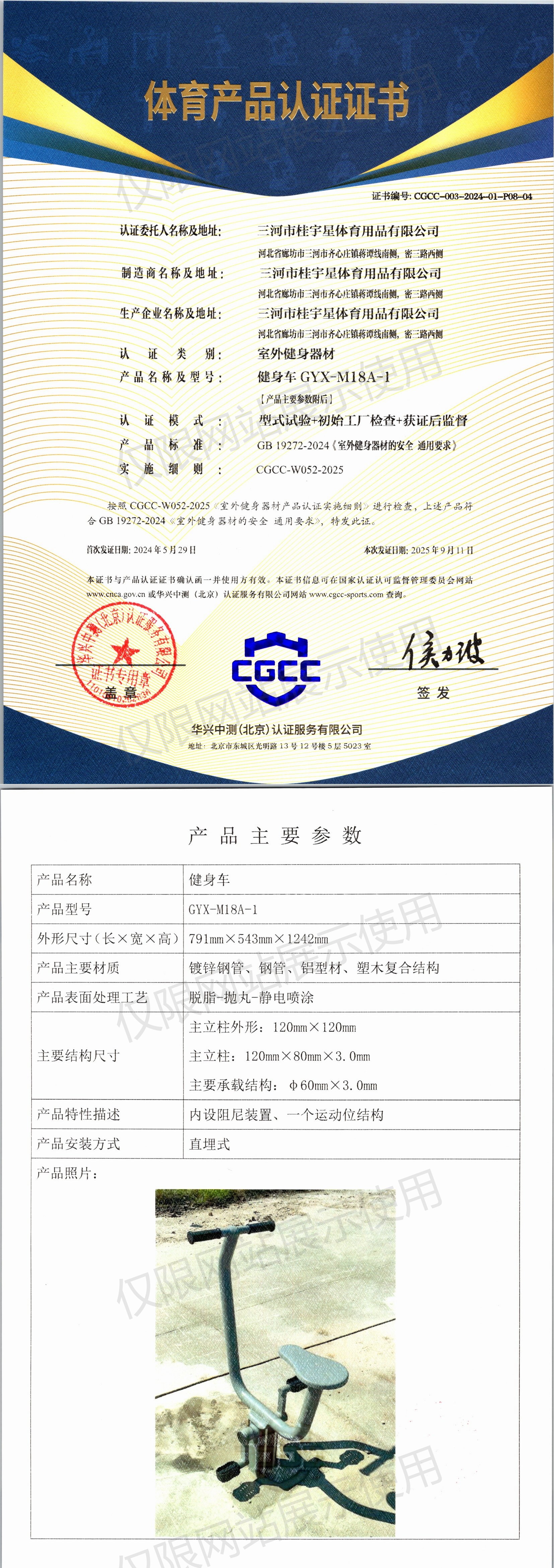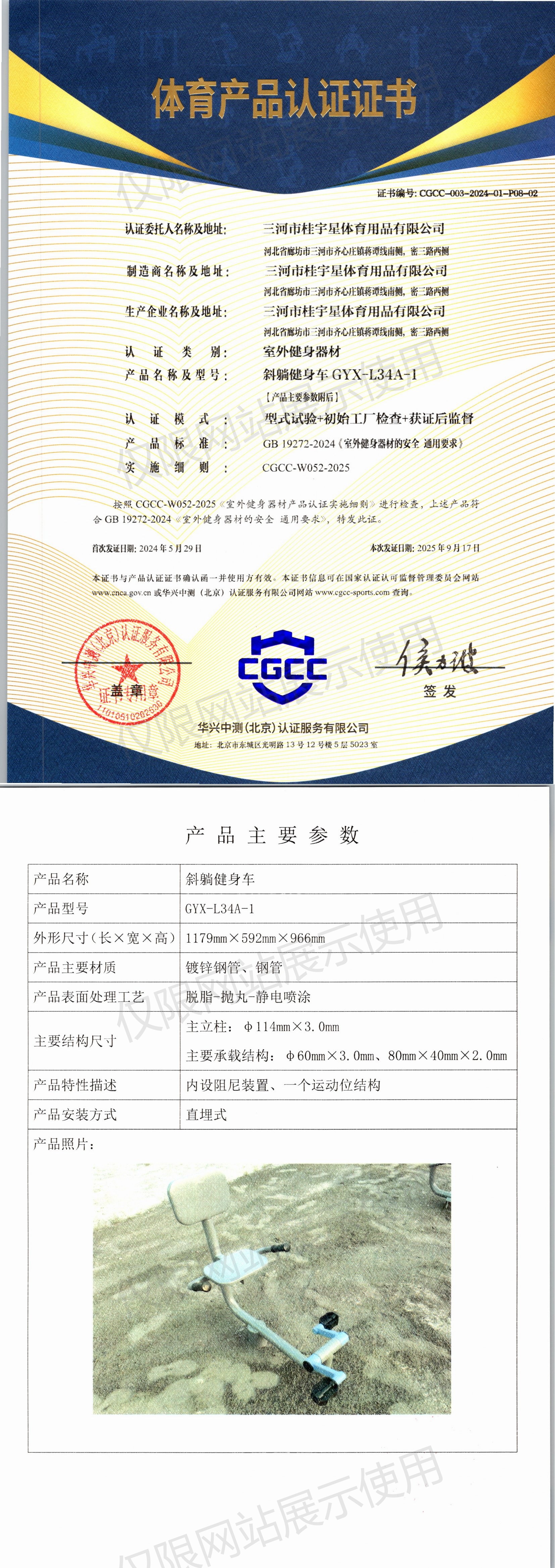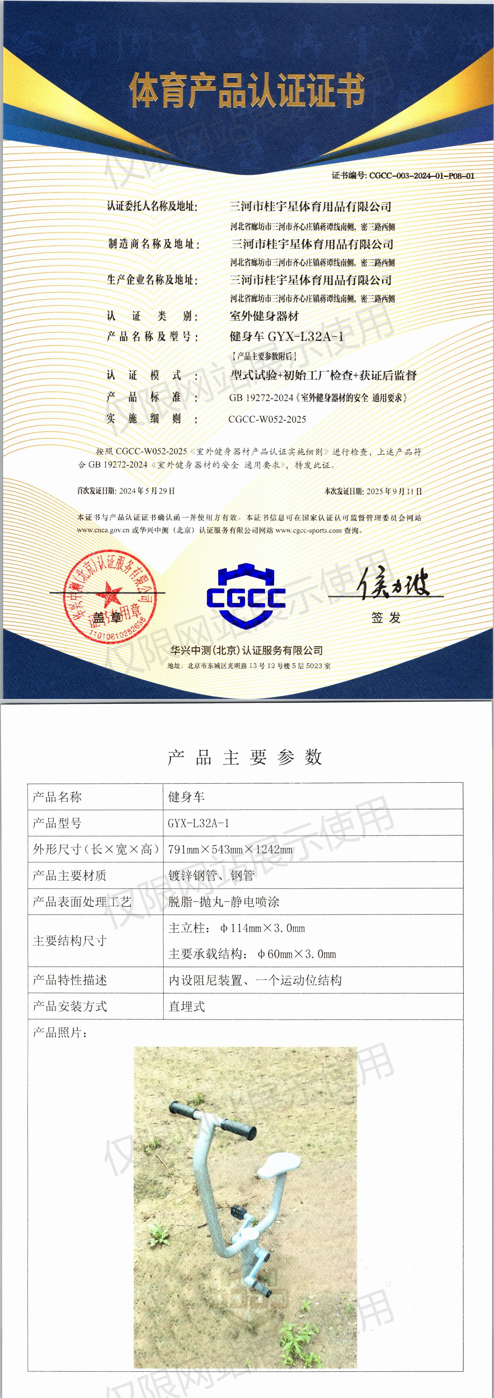 | 3 | 三河市桂宇星体育用品有限公司 | CGCC-003-2024-01-P08-02 | 斜躺健身车 | GYX-L34A-1 | 河北省廊坊市三河市齐心庄镇蒋谭线南侧,密三路西侧 | GB 19272-2024 | 2024-05-29 | 有效 | 查看 |