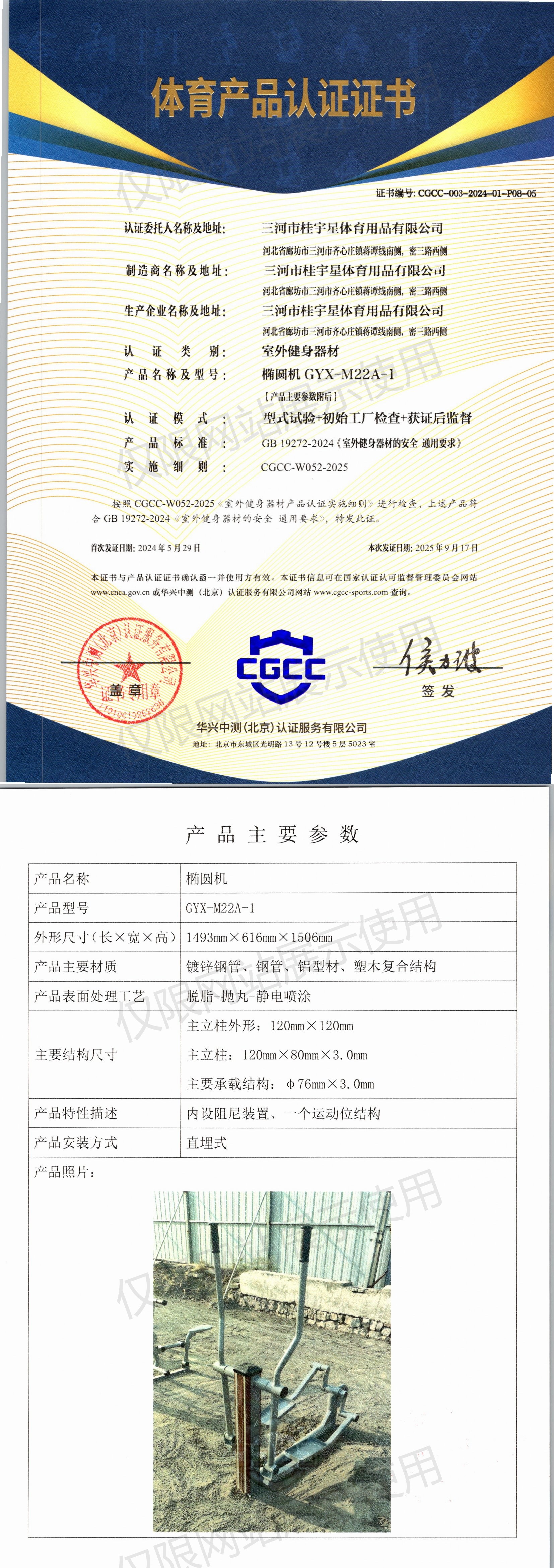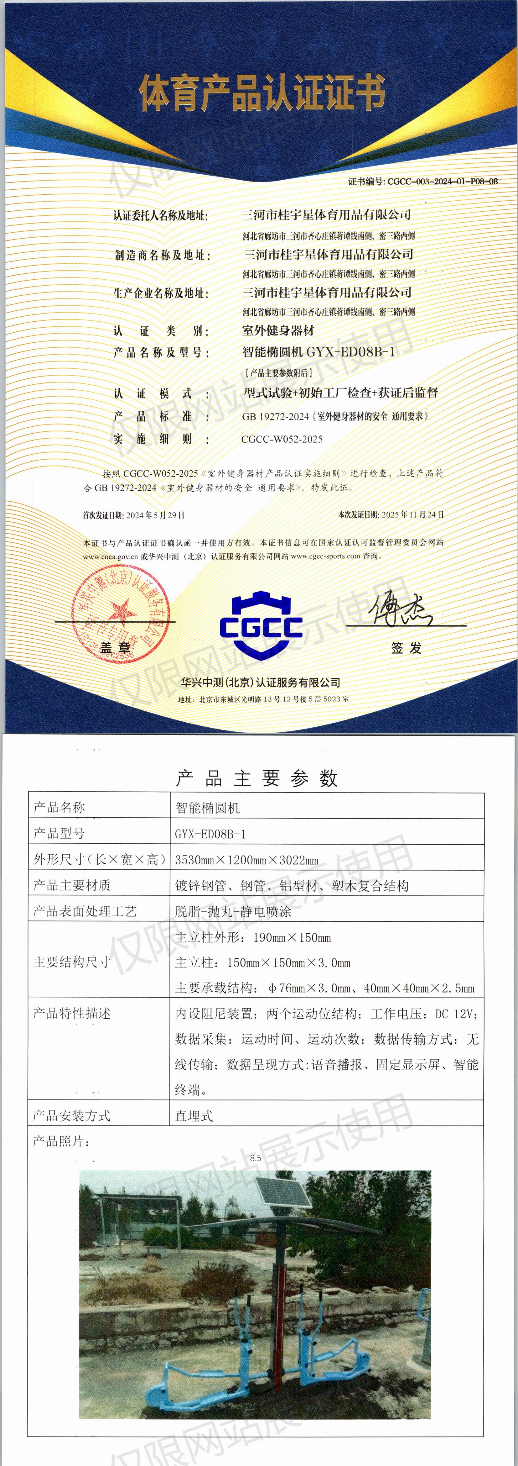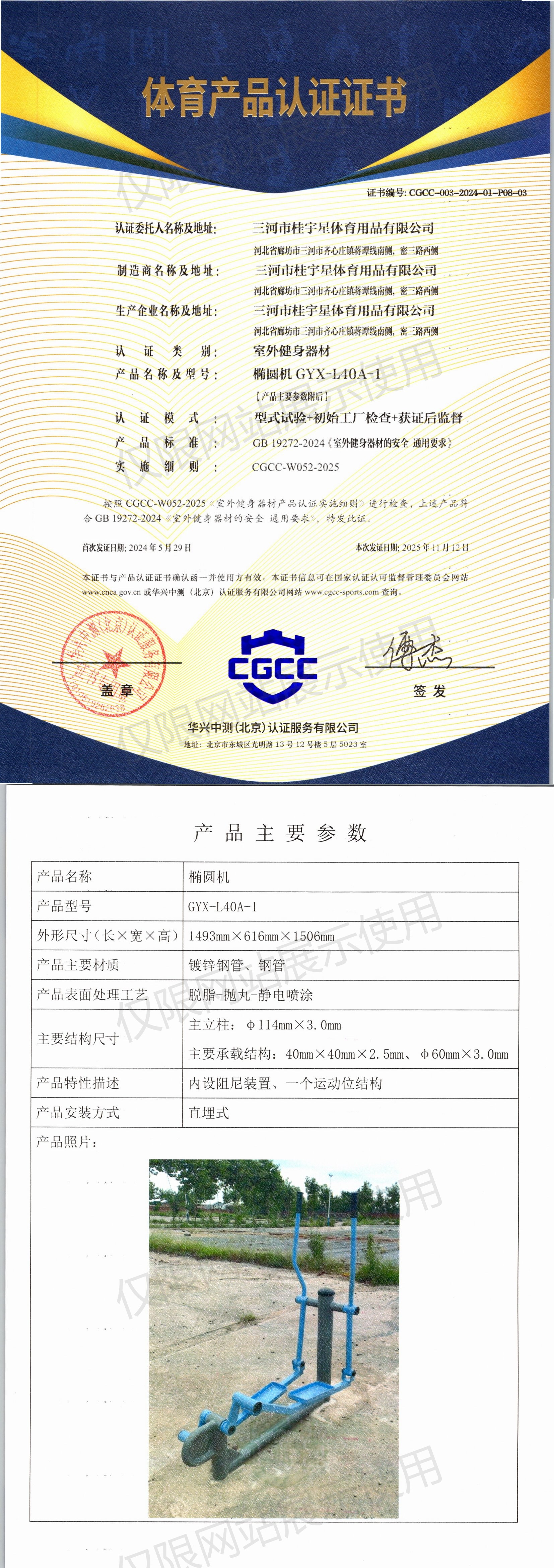 | 6 | 三河市桂宇星体育用品有限公司 | CGCC-003-2024-01-P08-05 | 椭圆机 | GYX-M22A-1 | 河北省廊坊市三河市齐心庄镇蒋谭线南侧,密三路西侧 | GB 19272-2024 | 2024-05-29 | 有效 | 查看 |