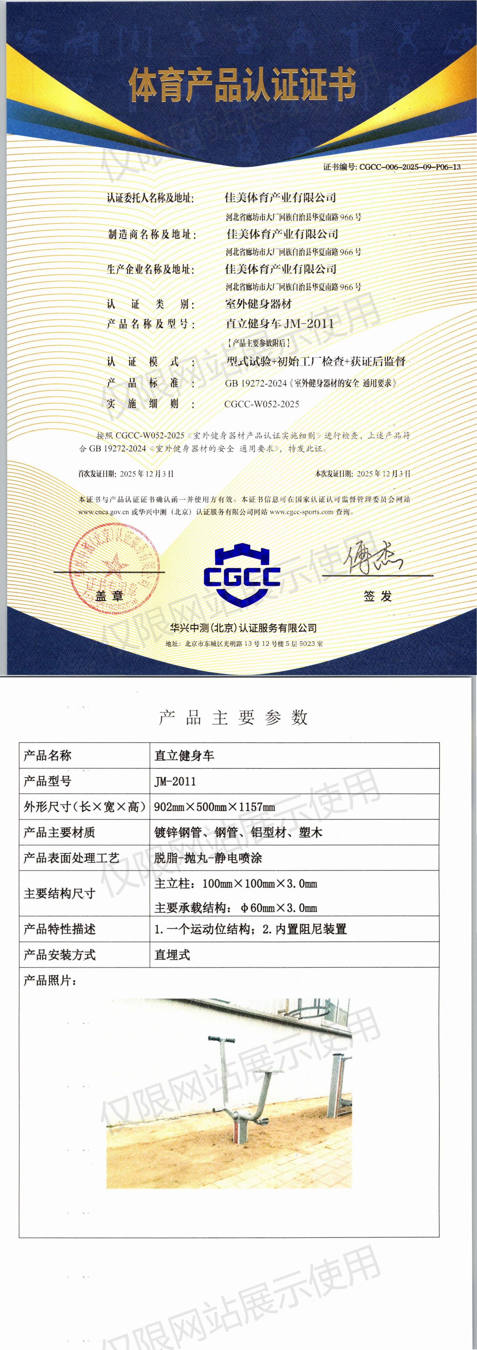 | 1 | 佳美体育产业有限公司 | CGCC-006-2025-09-P06-13 | 直立健身车 | JM-2011 | 河北省廊坊市大厂回族自治县华夏南路966号 | GB 19272-2024 | 2025-12-03 | 有效 | 查看 |