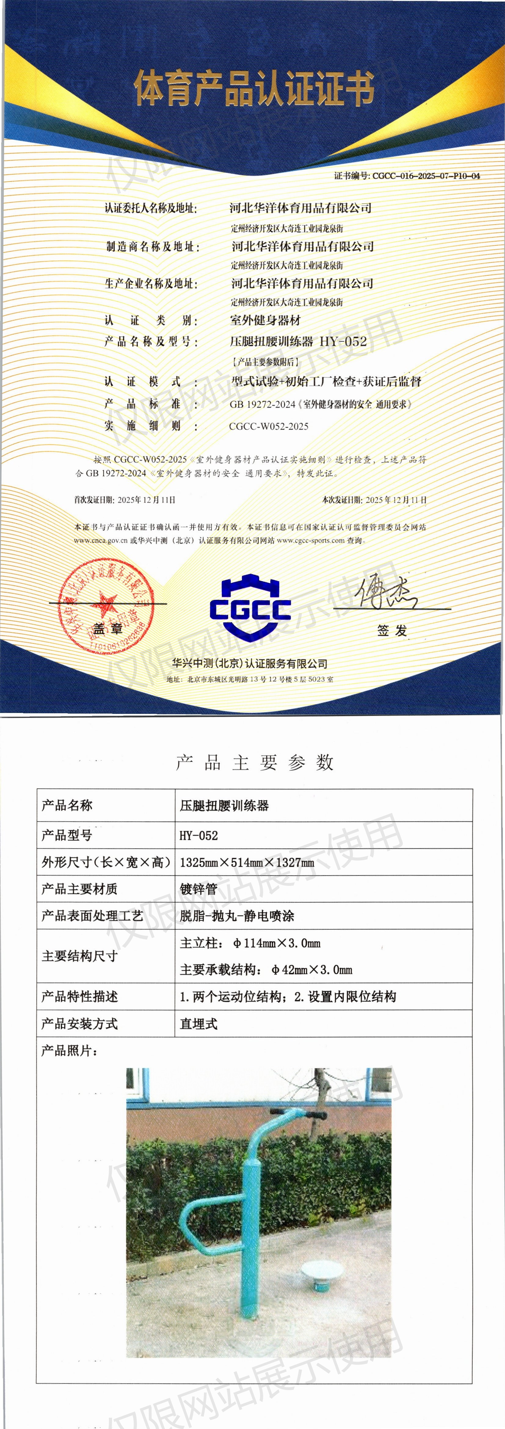 | 3 | 河北华洋体育用品有限公司 | CGCC-016-2025-07-P10-04 | 压腿扭腰训练器 | HY-052 | 定州经济开发区大奇连工业园龙泉街 | GB 19272-2024 | 2025-12-11 | 有效 | 查看 |