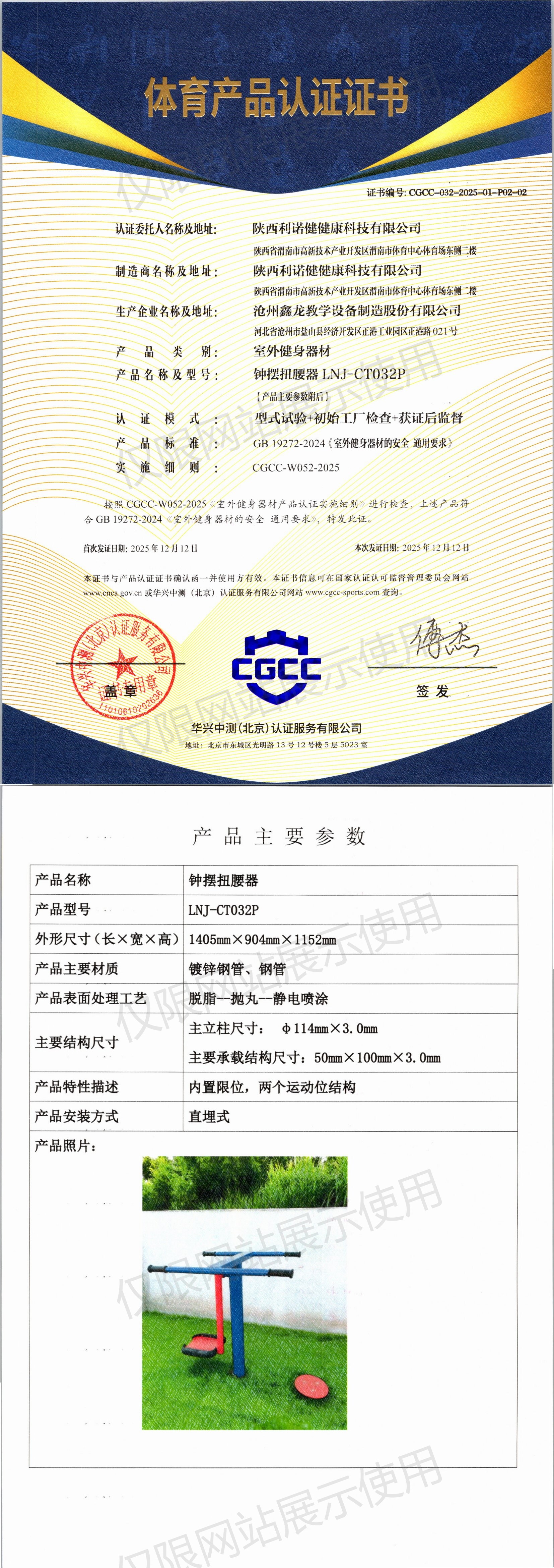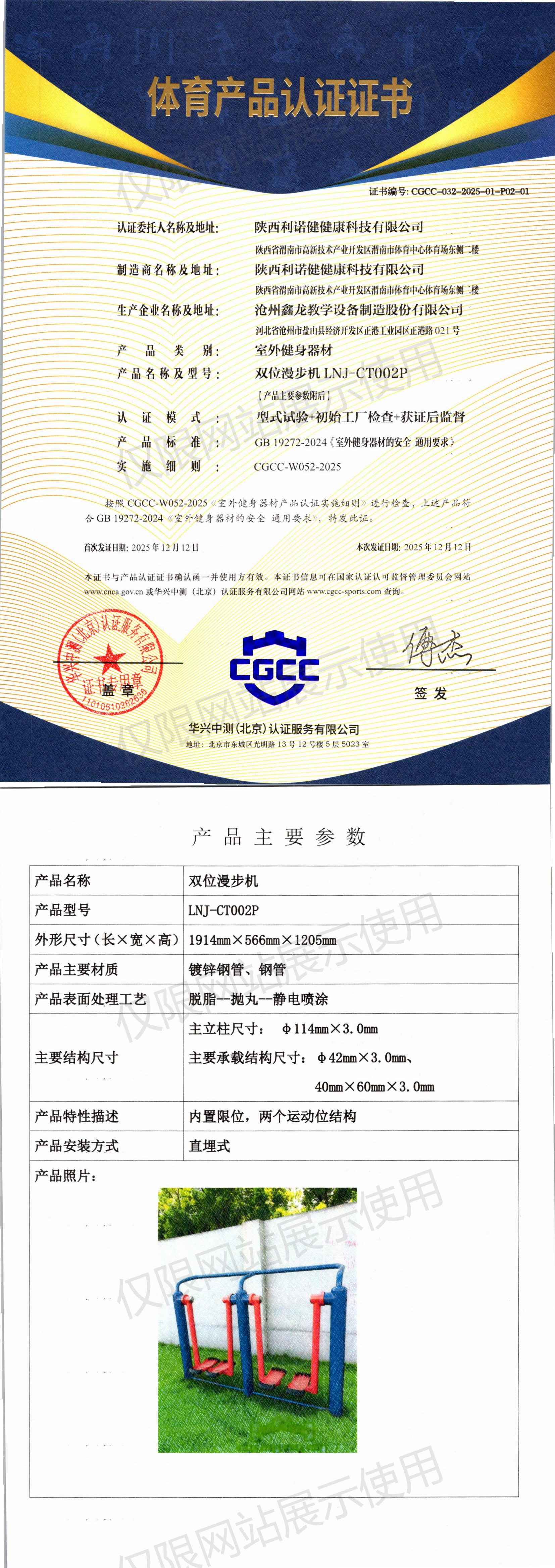 | 6 | 陕西利诺健健康科技有限公司 | CGCC-032-2025-01-P02-01 | 双位漫步机 | LNJ-CT002P | 河北省沧州市盐山县经济开发区正港工业园区正港路 021号 | GB 19272-2024 | 2025-12-12 | 有效 | 查看 |