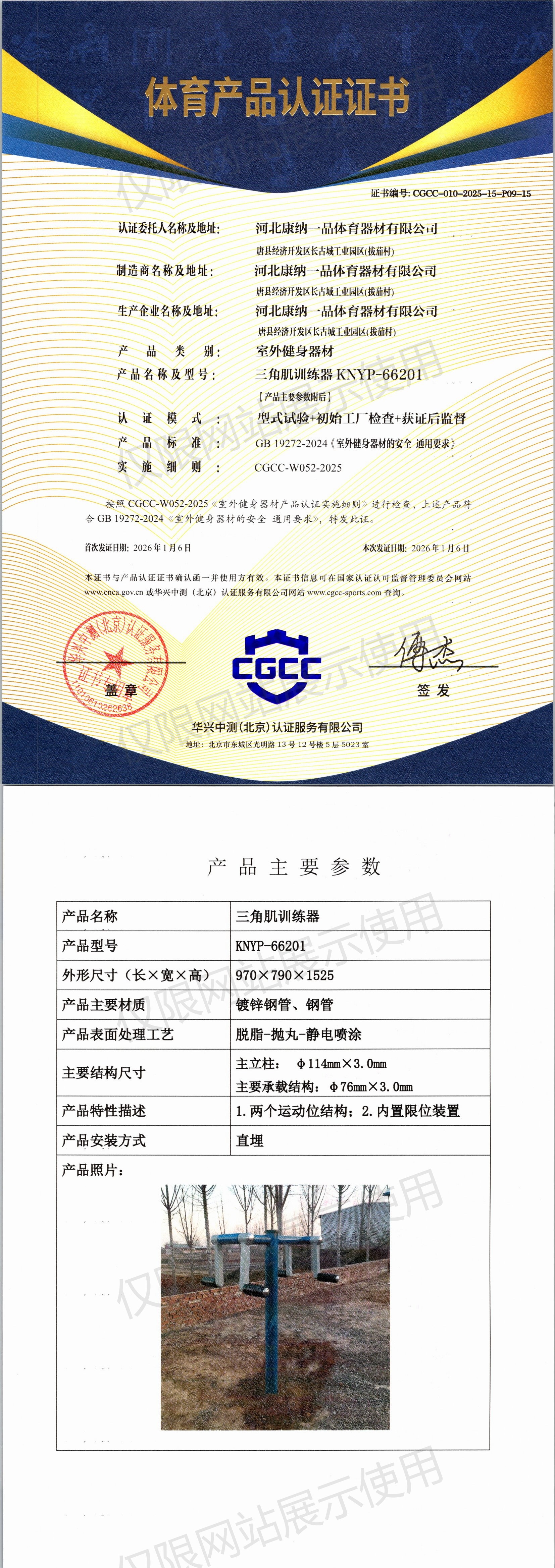 | 4 | 河北康纳一品体育器材有限公司 | CGCC-010-2025-15-P09-15 | 三角肌训练器 | KNYP-66201 | 唐县经济开发区长古城工业园区(拔茄村) | GB 19272-2024 | 2026-01-06 | 有效 | 查看 |