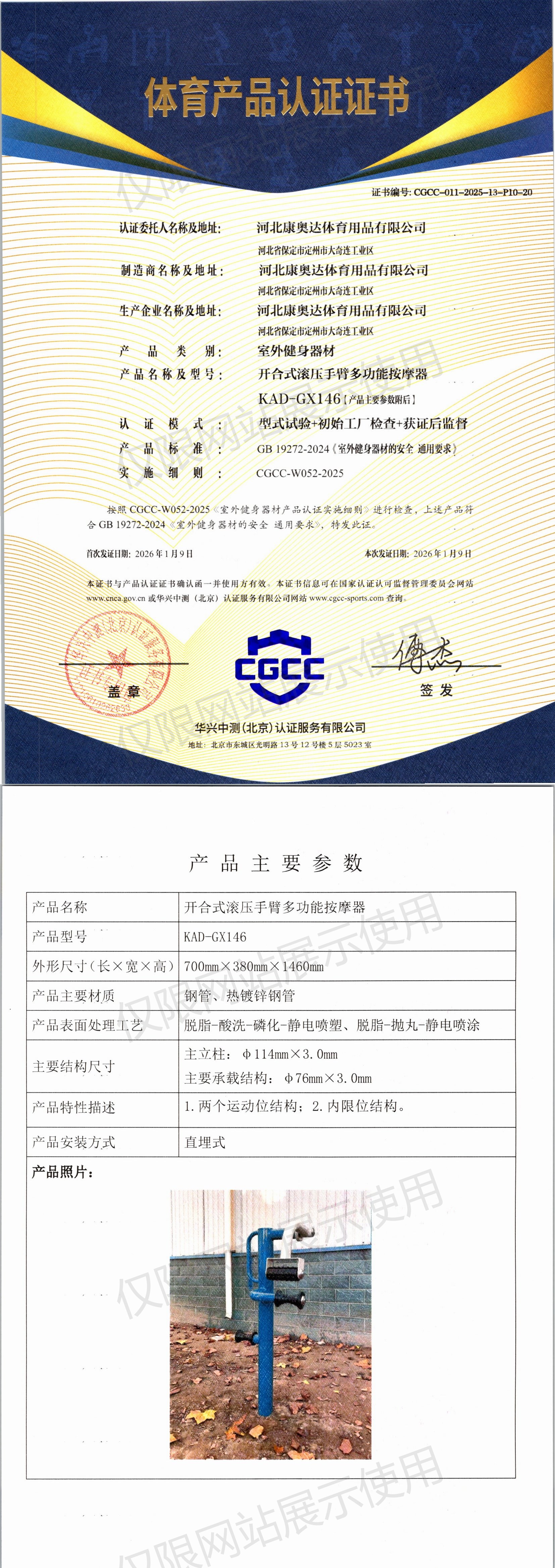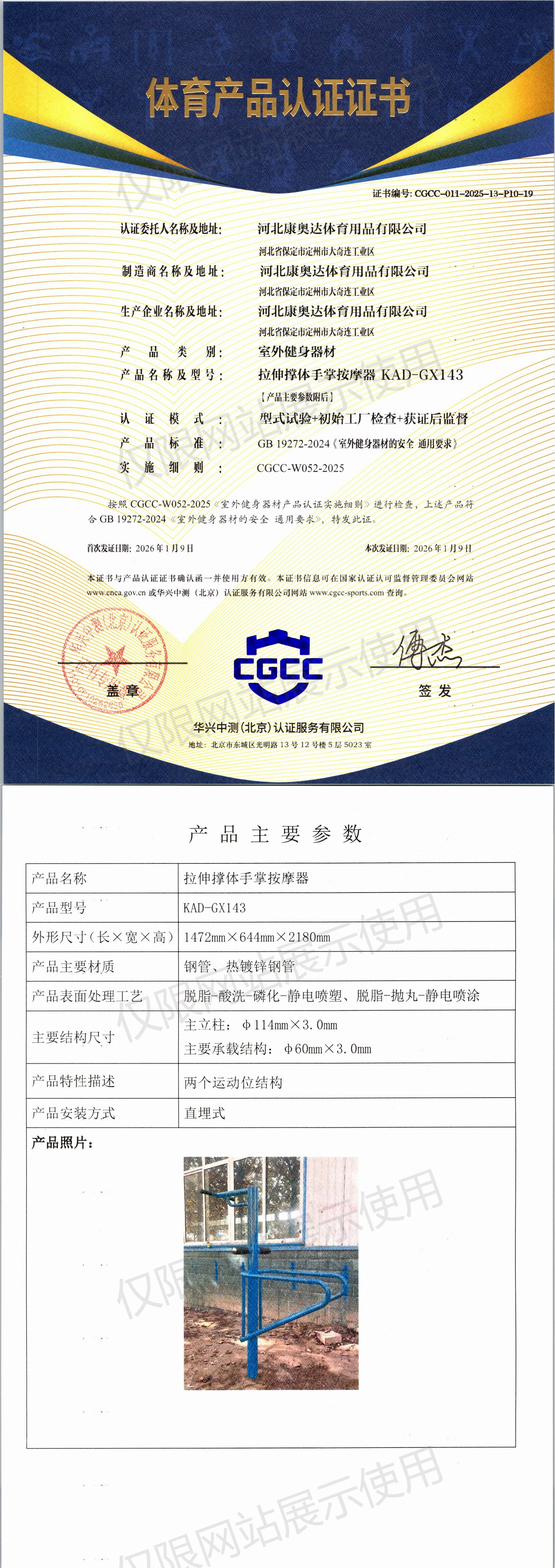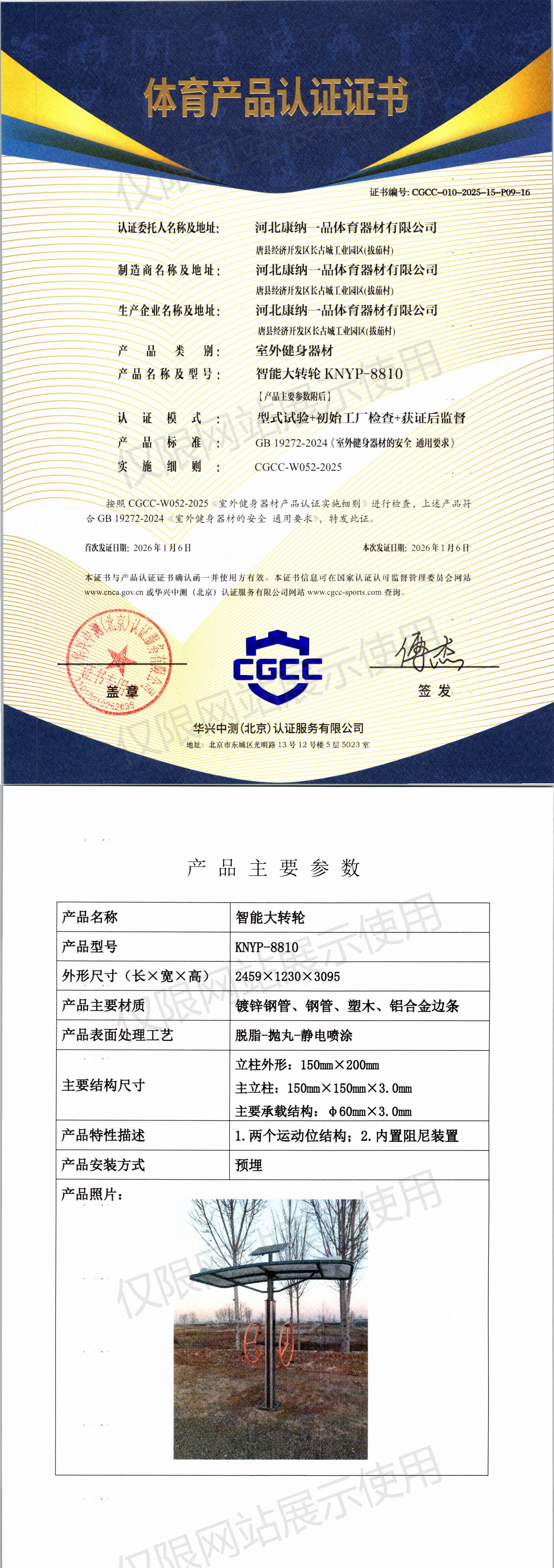 | 5 | 河北康纳一品体育器材有限公司 | CGCC-010-2025-15-P09-16 | 智能大转轮 | KNYP-8810 | 唐县经济开发区长古城工业园区(拔茄村) | GB 19272-2024 | 2026-01-06 | 有效 | 查看 |