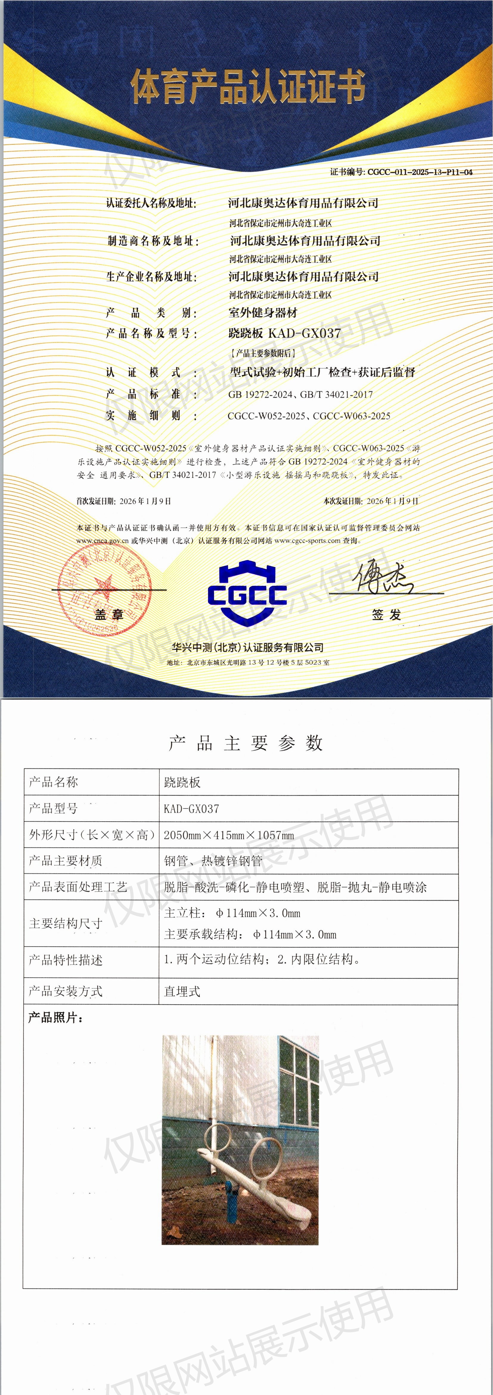 | 9 | 河北康奥达体育用品有限公司 | CGCC-011-2025-13-P11-04 | 跷跷板 | KAD-GX037 | 河北省保定市定州市大奇连工业区 | GB 19272-2024、GB/T 34021-2017 | 2026-01-09 | 有效 | 查看 |