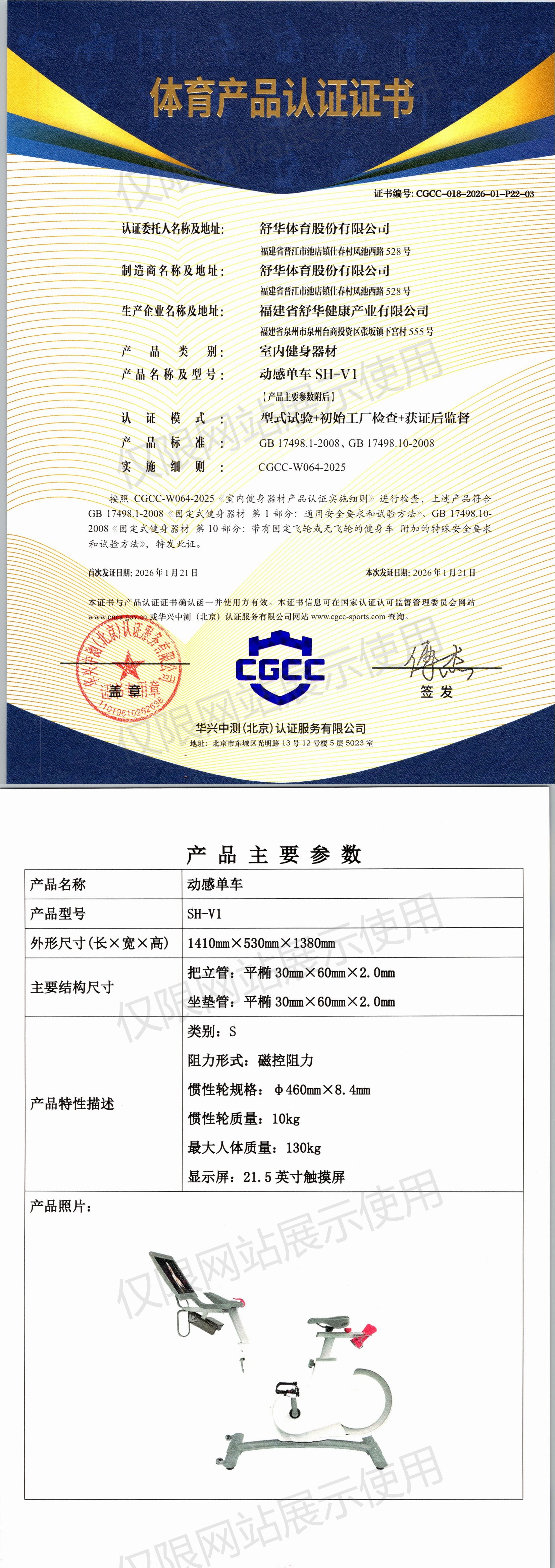 | 10 | 舒华体育股份有限公司 | CGCC-018-2026-01-P22-03 | 动感单车 | SH-V1 | 福建省泉州市泉州台商投资区张坂镇下宫村555号 | GB 17498.1-2008、GB 17498.10-2008 | 2026-01-21 | 有效 | 查看 |