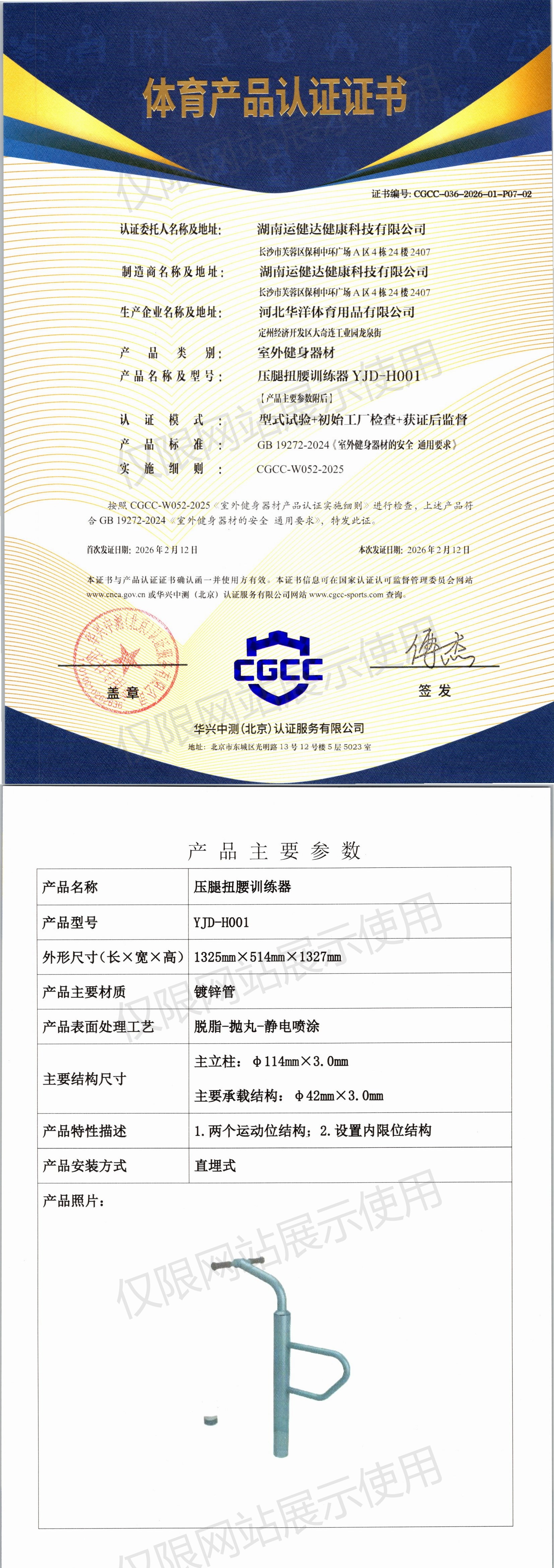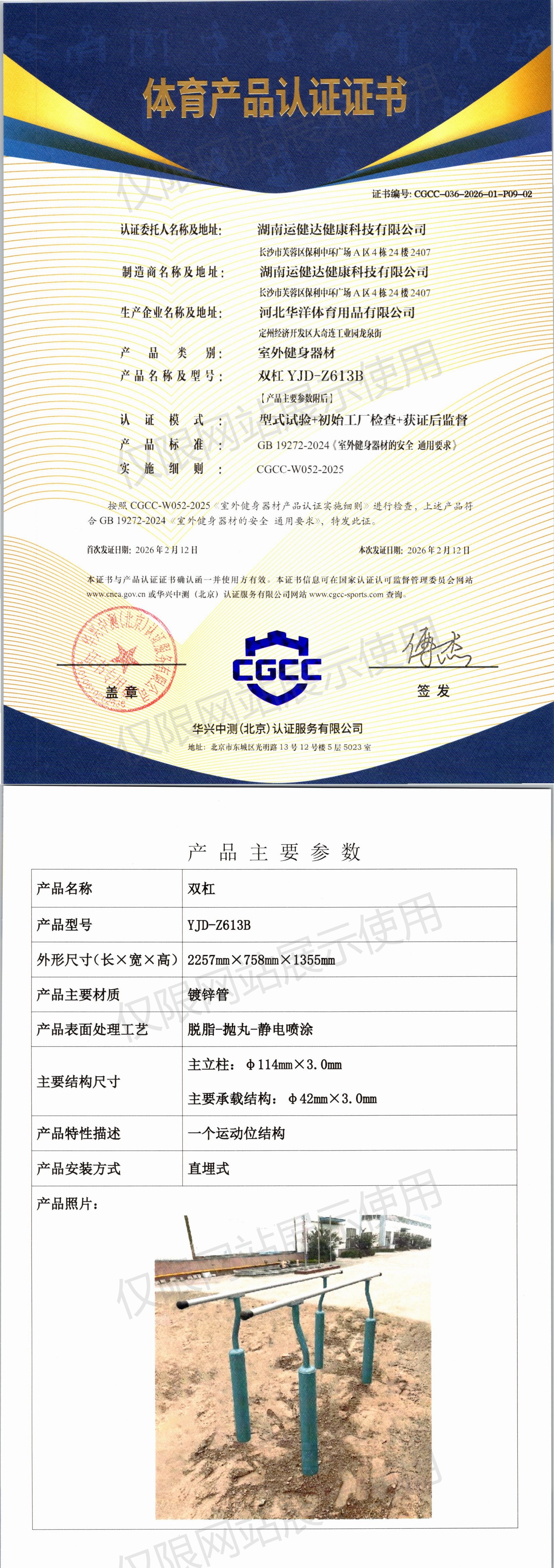 | 4 | 湖南运健达健康科技有限公司 | CGCC-036-2026-01-P09-02 | 双杠 | YJD-Z613B | 定州经济开发区大奇连工业园龙泉街 | GB 19272-2024 | 2026-02-12 | 有效 | 查看 |