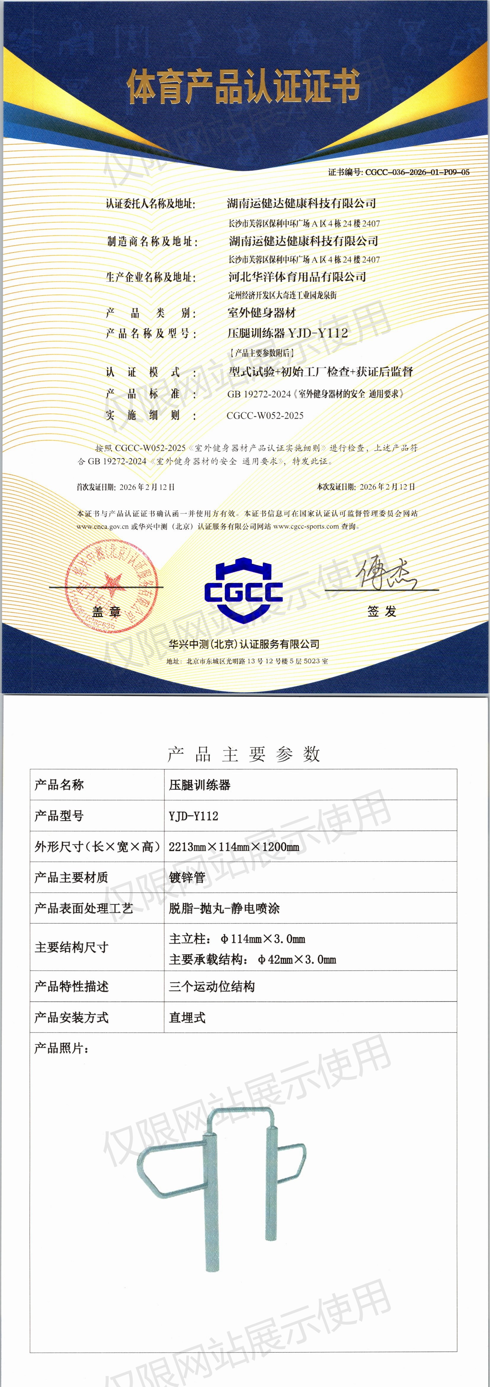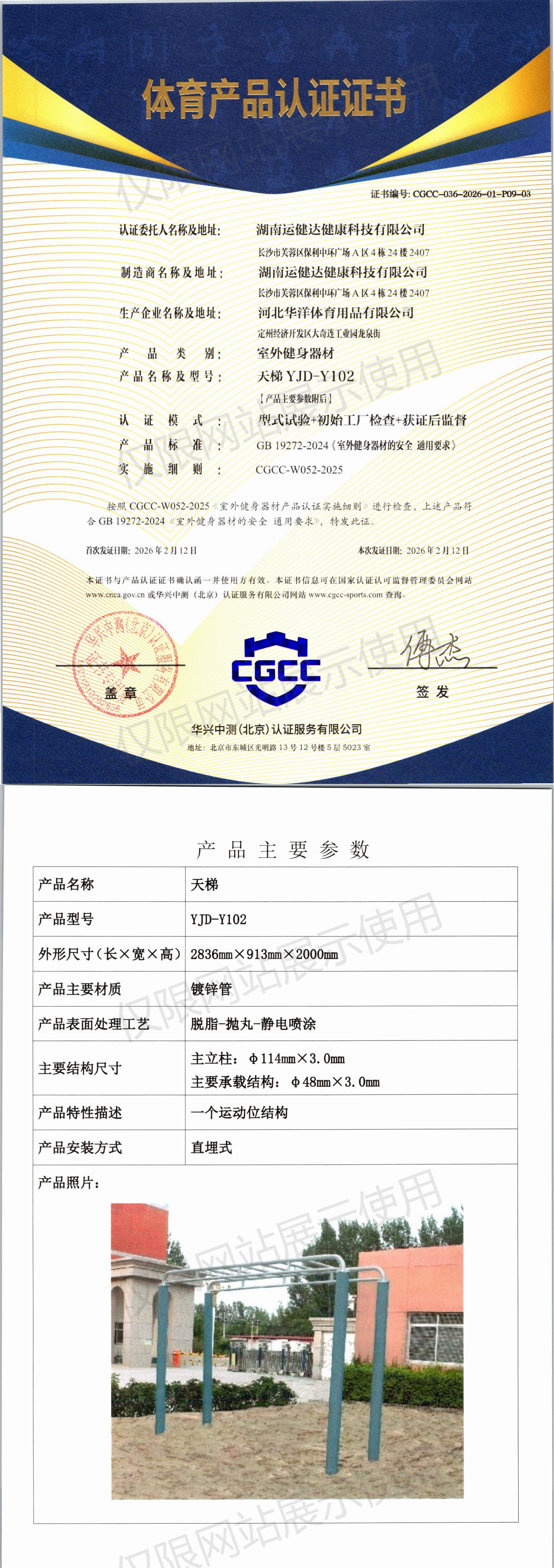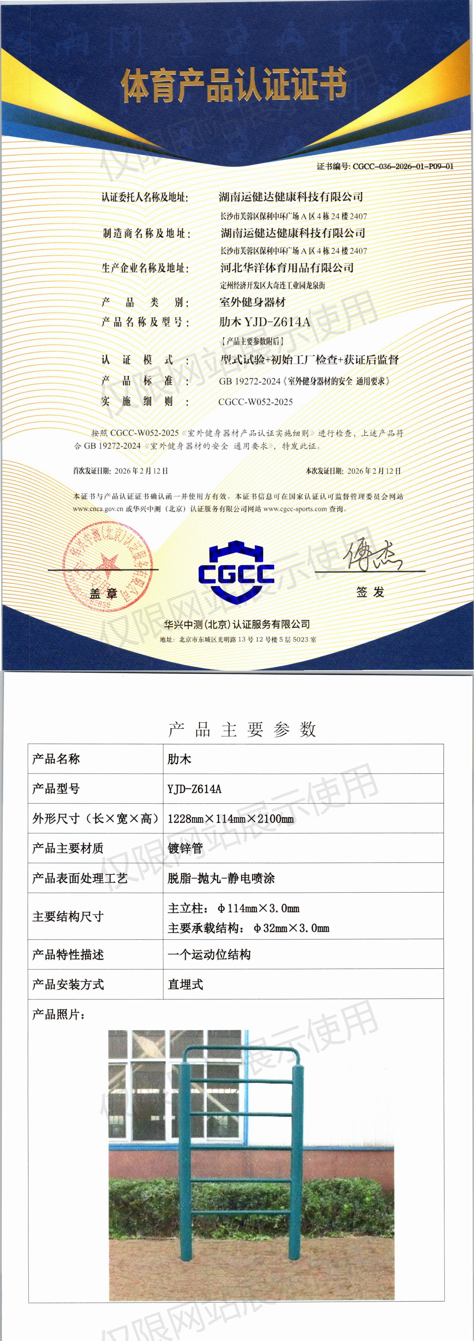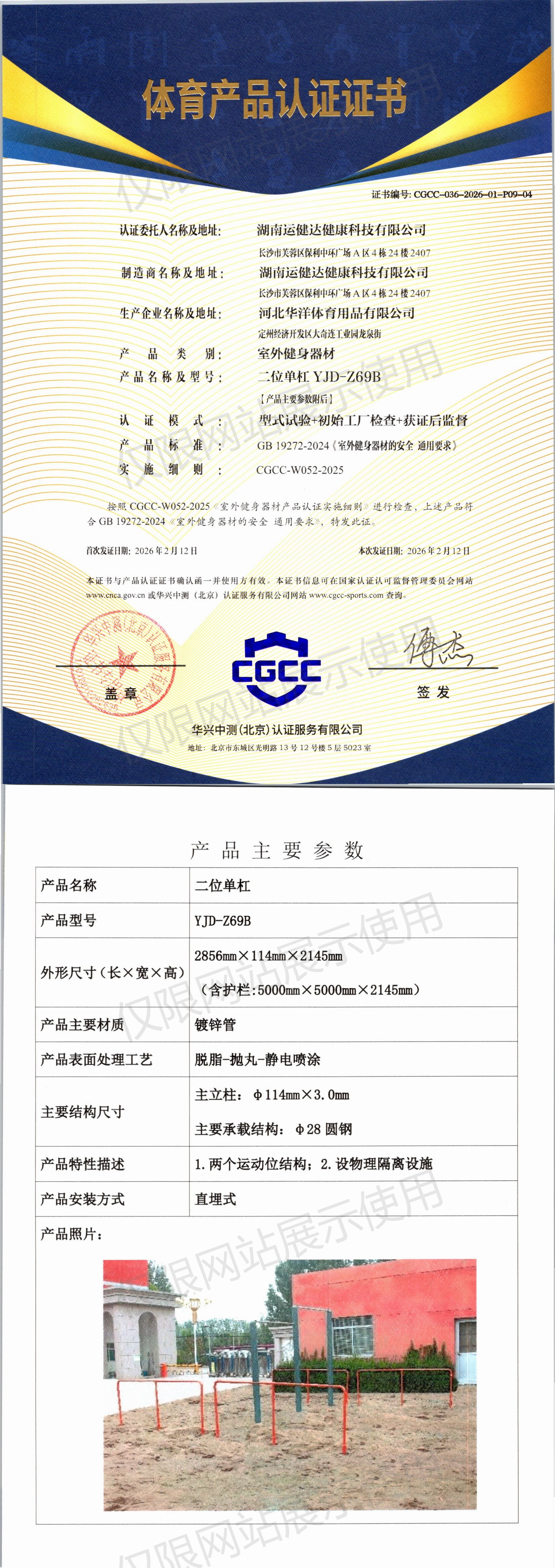 | 6 | 湖南运健达健康科技有限公司 | CGCC-036-2026-01-P09-04 | 二位单杠 | YJD-Z69B | 定州经济开发区大奇连工业园龙泉街 | GB 19272-2024 | 2026-02-12 | 有效 | 查看 |