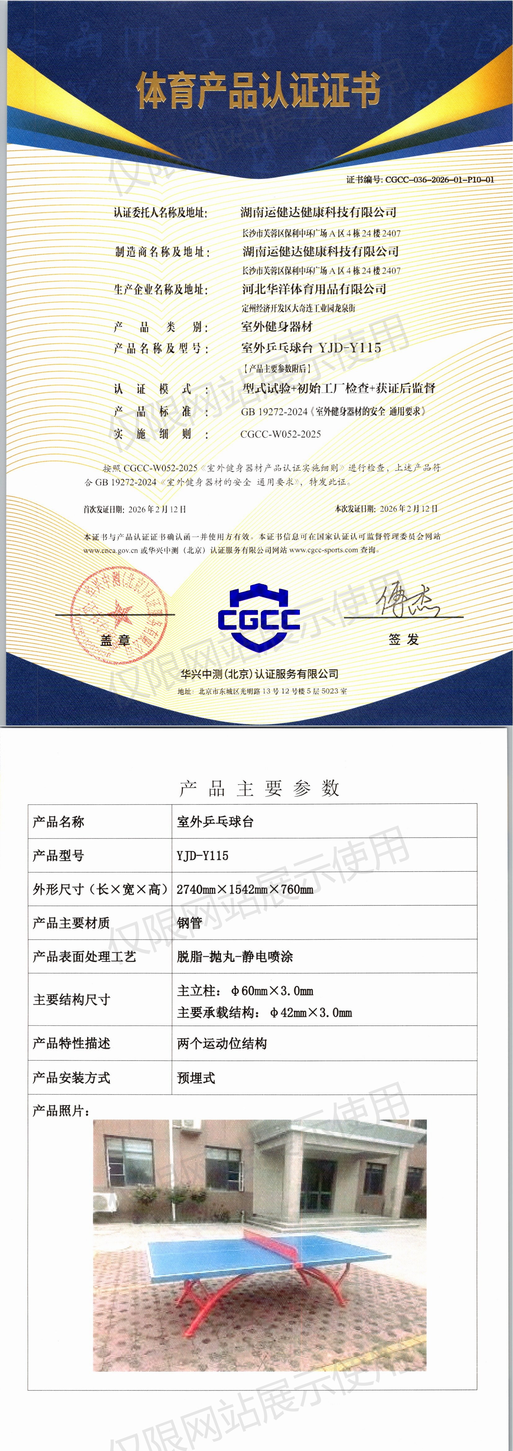 | 8 | 湖南运健达健康科技有限公司 | CGCC-036-2026-01-P10-01 | 室外乒乓球台 | YJD-Y115 | 定州经济开发区大奇连工业园龙泉街 | GB 19272-2024 | 2026-02-12 | 有效 | 查看 |