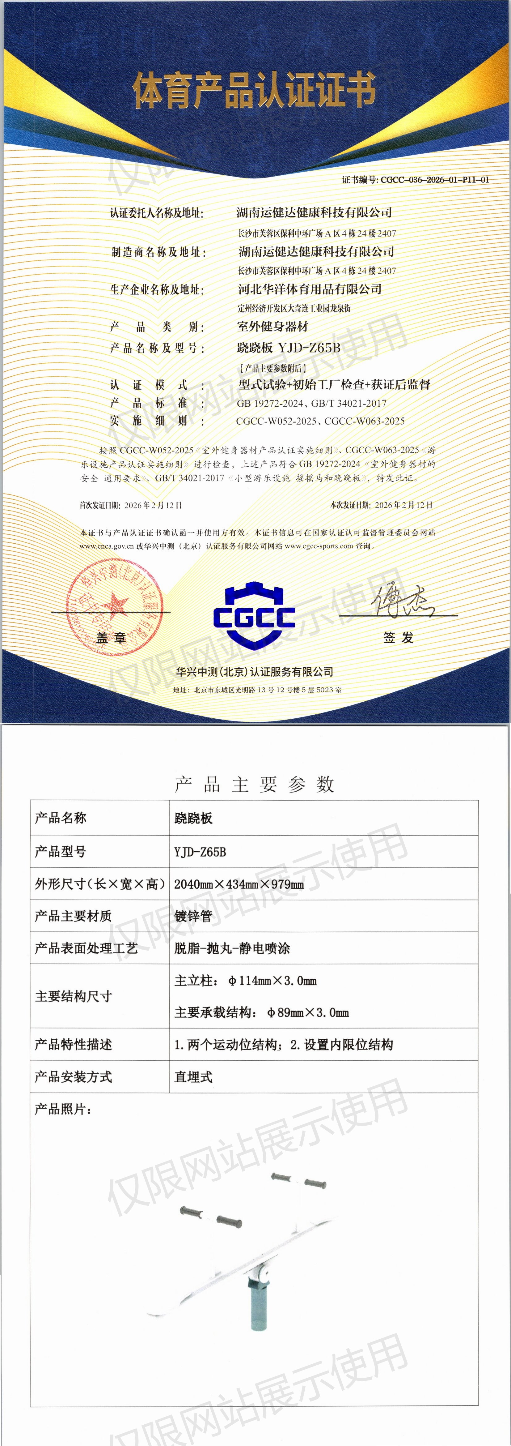 | 9 | 湖南运健达健康科技有限公司 | CGCC-036-2026-01-P11-01 | 跷跷板 | YJD-Z65B | 定州经济开发区大奇连工业园龙泉街 | GB 19272-2024、GB/T 34021-2017 | 2026-02-12 | 有效 | 查看 |