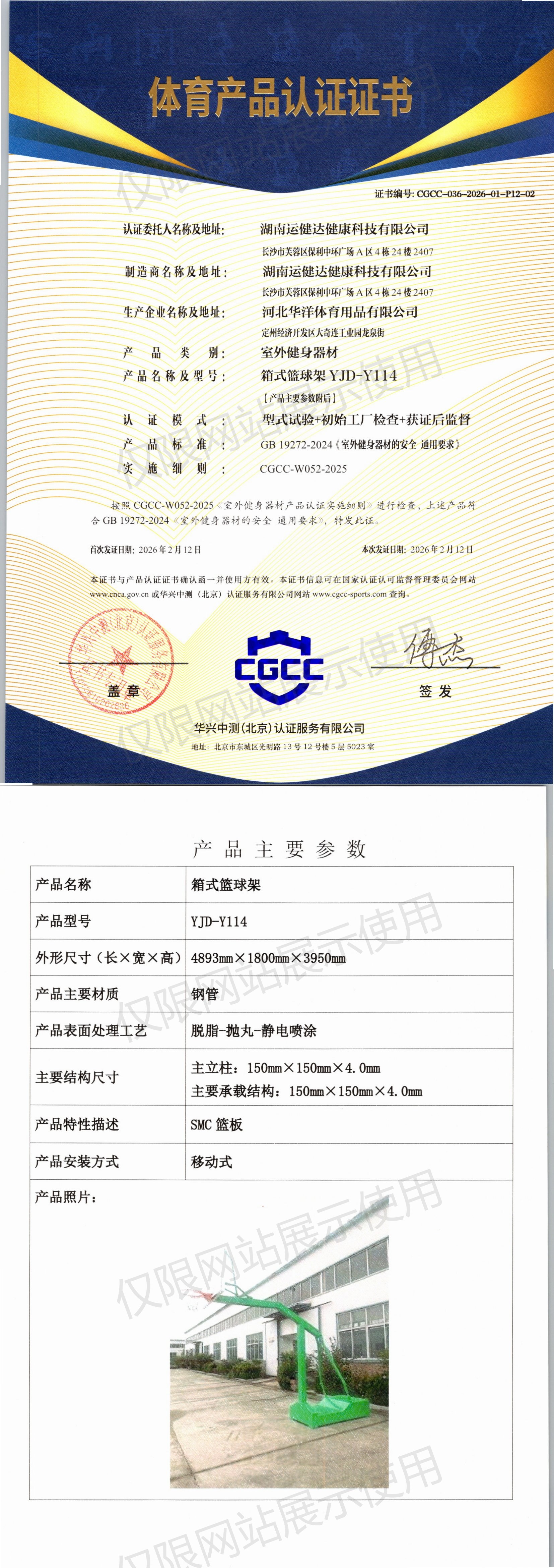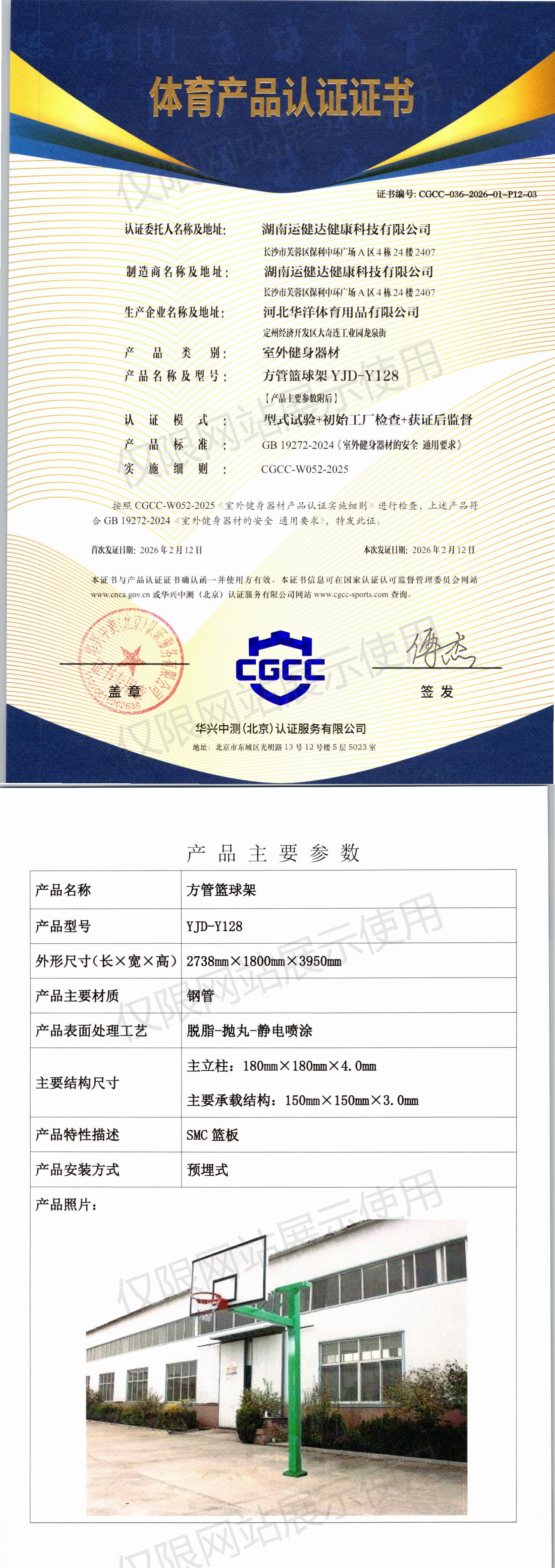 | 2 | 湖南运健达健康科技有限公司 | CGCC-036-2026-01-P12-03 | 方管篮球架 | YJD-Y128 | 定州经济开发区大奇连工业园龙泉街 | GB 19272-2024 | 2026-02-12 | 有效 | 查看 |