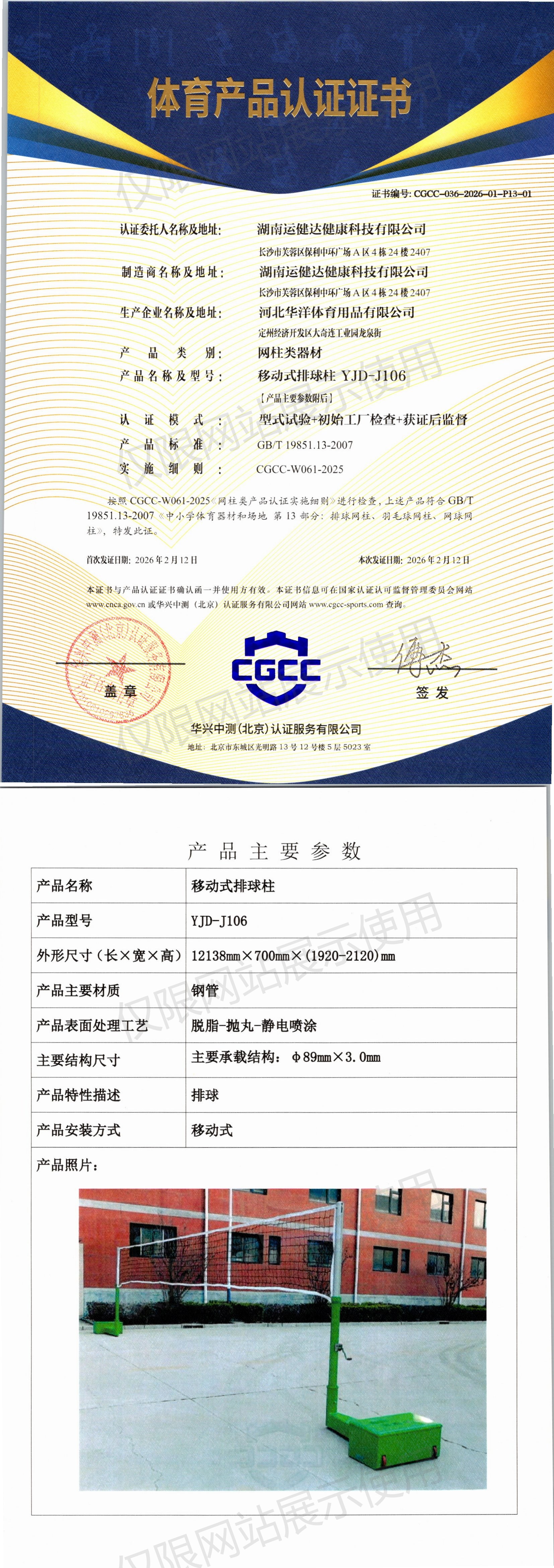 | 3 | 湖南运健达健康科技有限公司 | CGCC-036-2026-01-P13-01 | 移动式排球柱 | YJD-J106 | 定州经济开发区大奇连工业园龙泉街 | GB/T 19851.13-2007 | 2026-02-12 | 有效 | 查看 |