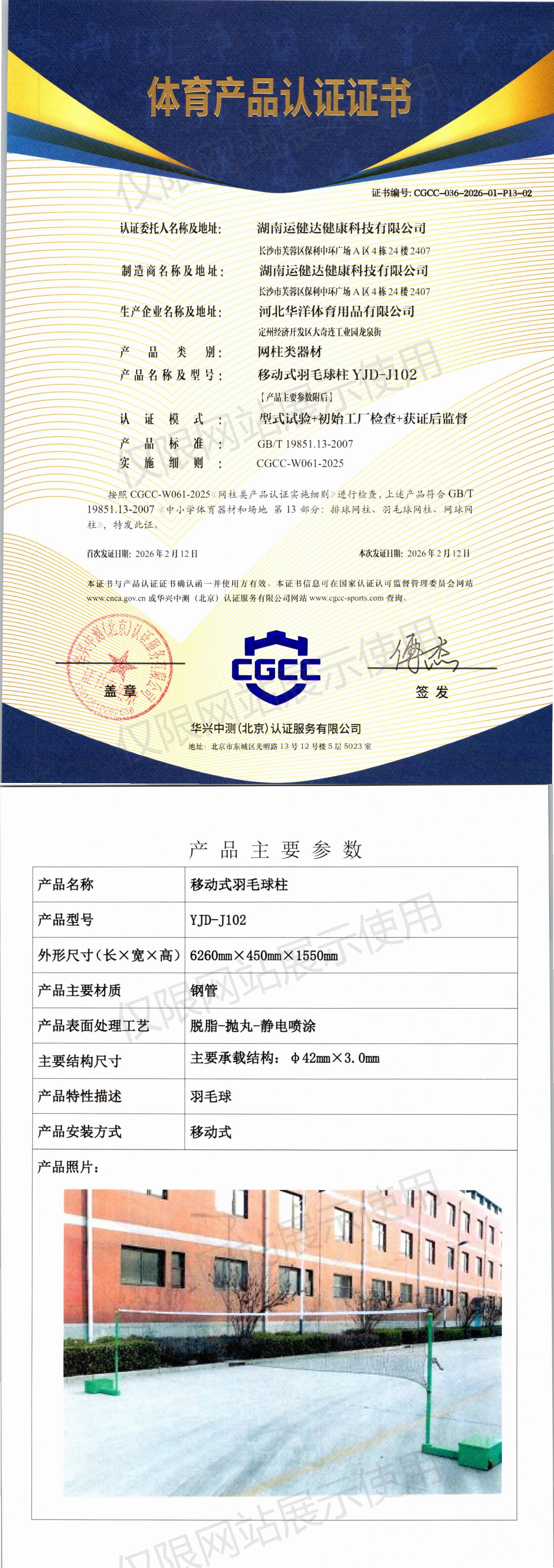 | 4 | 湖南运健达健康科技有限公司 | CGCC-036-2026-01-P13-02 | 移动式羽毛球柱 | YJD-J102 | 定州经济开发区大奇连工业园龙泉街 | GB/T 19851.13-2007 | 2026-02-12 | 有效 | 查看 |
