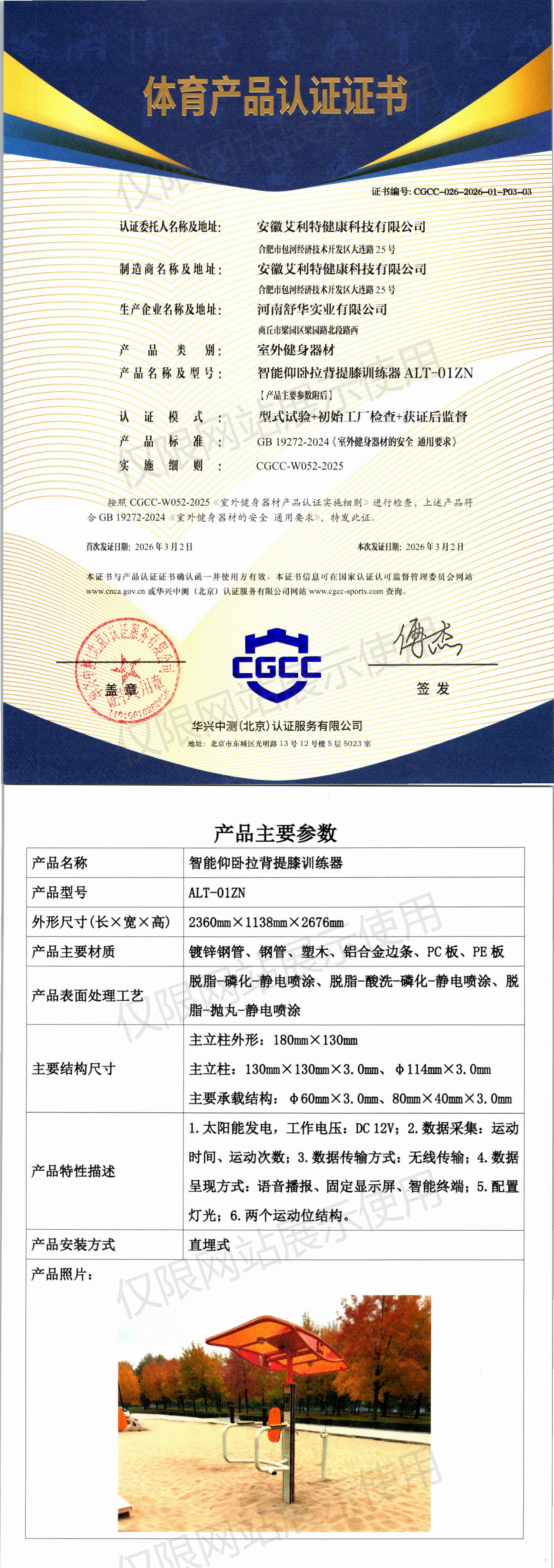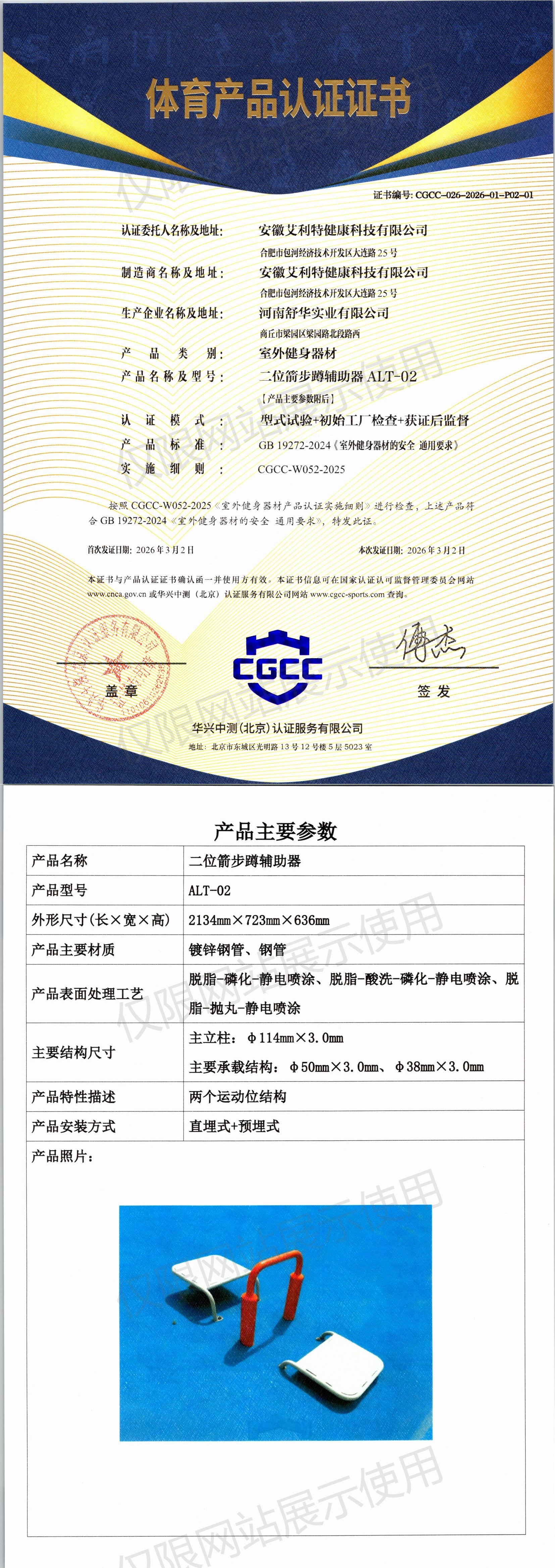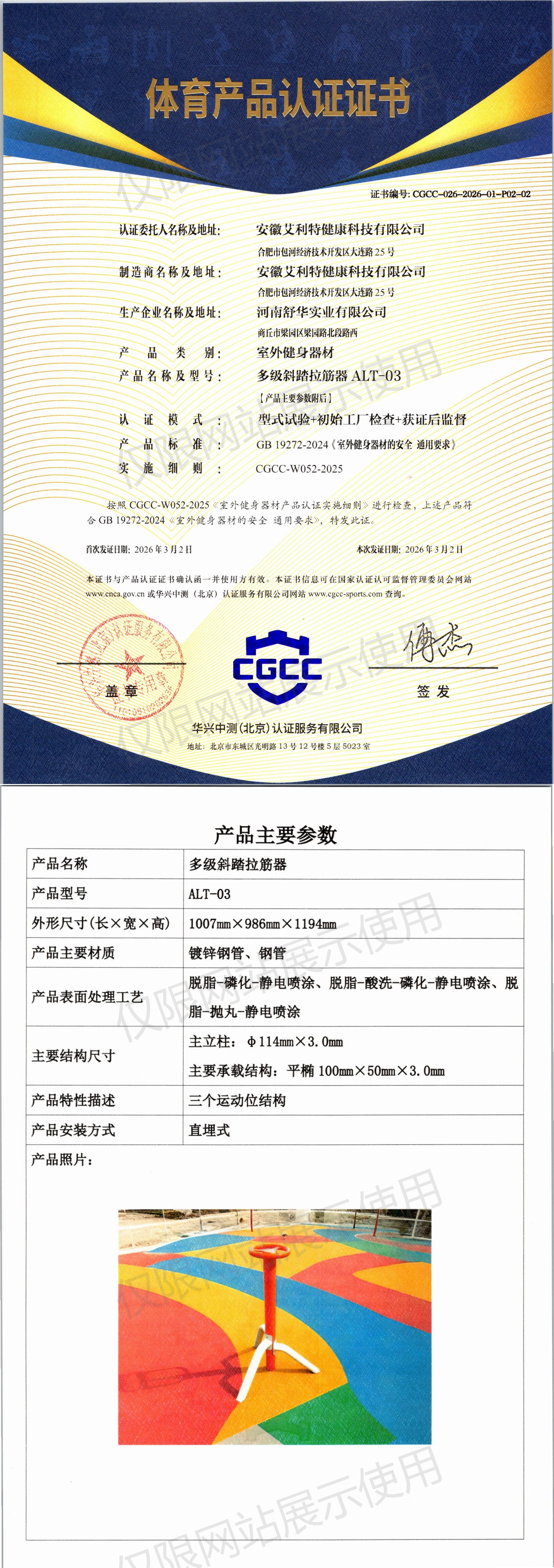 | 7 | 安徽艾利特健康科技有限公司 | CGCC-026-2026-01-P02-02 | 多级斜踏拉筋器 | ALT-03 | 商丘市梁园区梁园路北段路西 | GB 19272-2024 | 2026-03-02 | 有效 | 查看 |