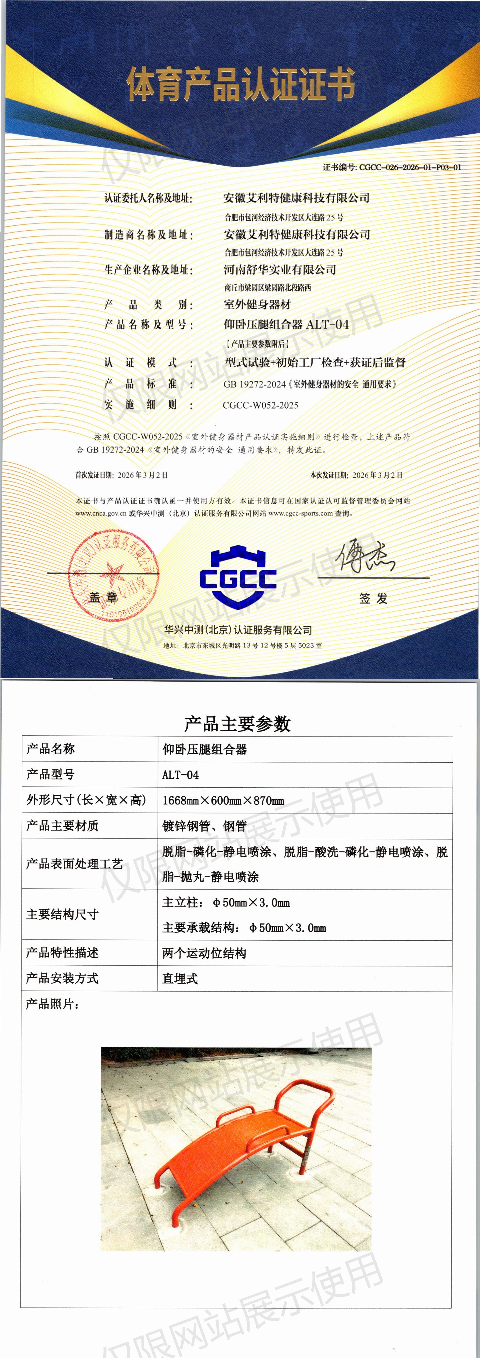 | 8 | 安徽艾利特健康科技有限公司 | CGCC-026-2026-01-P03-01 | 仰卧压腿组合器 | ALT-04 | 商丘市梁园区梁园路北段路西 | GB 19272-2024 | 2026-03-02 | 有效 | 查看 |
