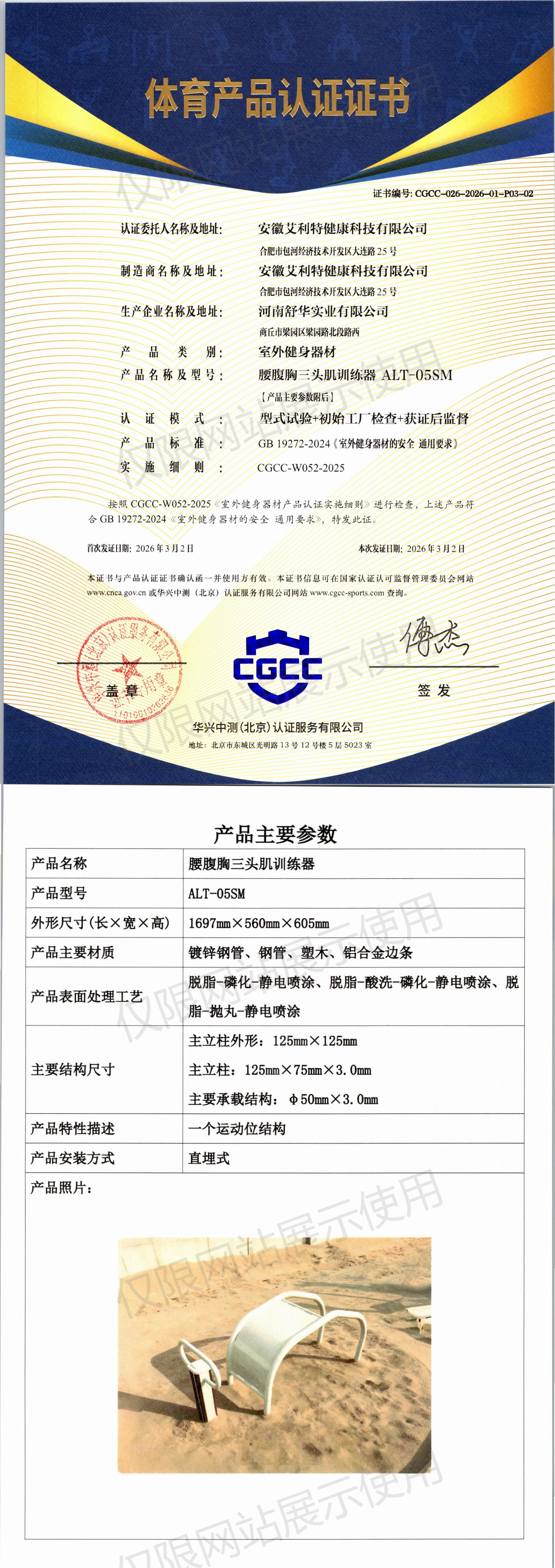 | 9 | 安徽艾利特健康科技有限公司 | CGCC-026-2026-01-P03-02 | 腰腹胸三头肌训练器 | ALT-05SM | 商丘市梁园区梁园路北段路西 | GB 19272-2024 | 2026-03-02 | 有效 | 查看 |