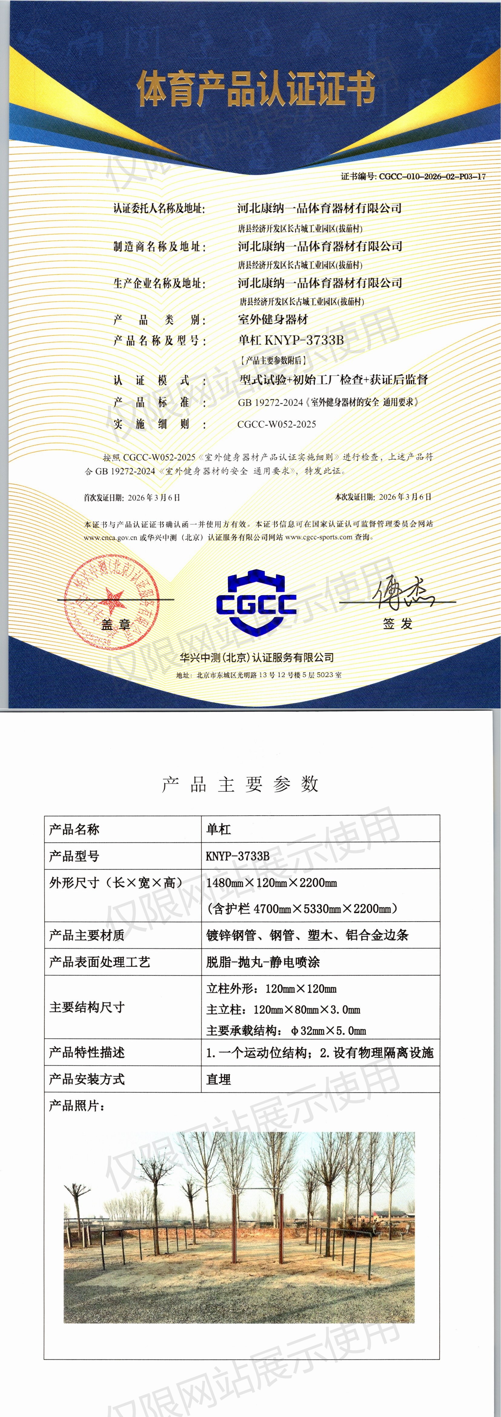| 2 | 河北康纳一品体育器材有限公司 | CGCC-010-2026-02-P03-17 | 单杠 | KNYP-3733B | 唐县经济开发区长古城工业园区(拔茄村) | GB 19272-2024 | 2026-03-06 | 有效 | 查看 |