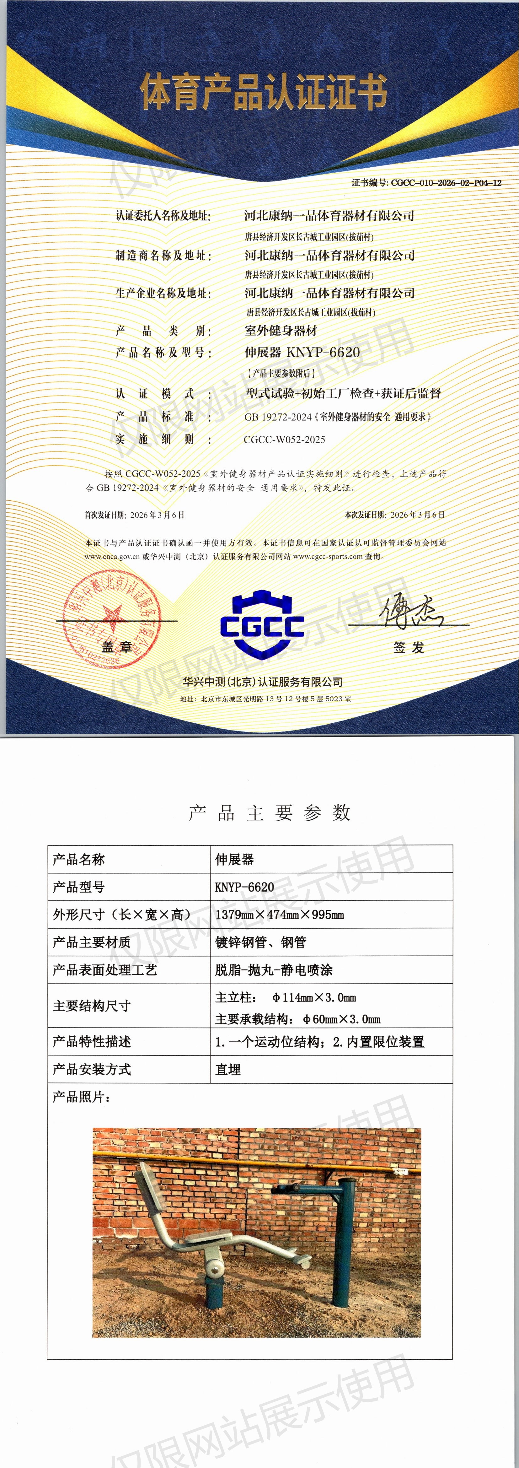 | 3 | 河北康纳一品体育器材有限公司 | CGCC-010-2026-02-P04-12 | 伸展器 | KNYP-6620 | 唐县经济开发区长古城工业园区(拔茄村) | GB 19272-2024 | 2026-03-06 | 有效 | 查看 |