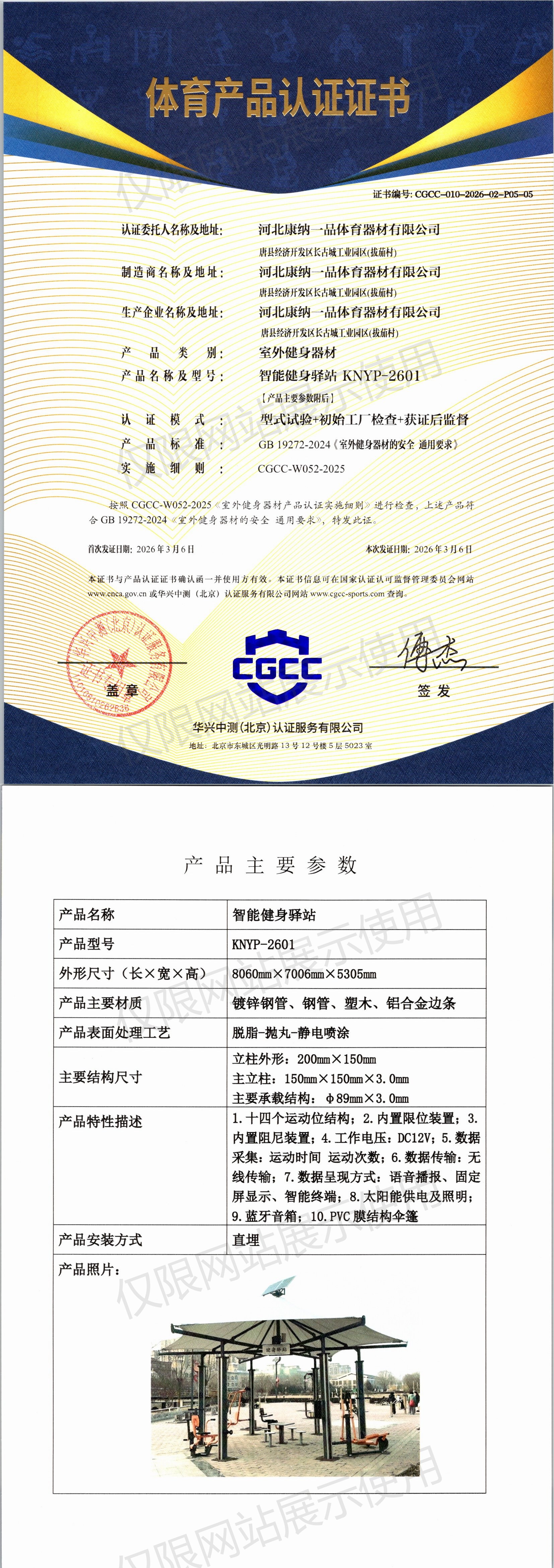 | 4 | 河北康纳一品体育器材有限公司 | CGCC-010-2026-02-P05-05 | 智能健身驿站 | KNYP-2601 | 唐县经济开发区长古城工业园区(拔茄村) | GB 19272-2024 | 2026-03-06 | 有效 | 查看 |